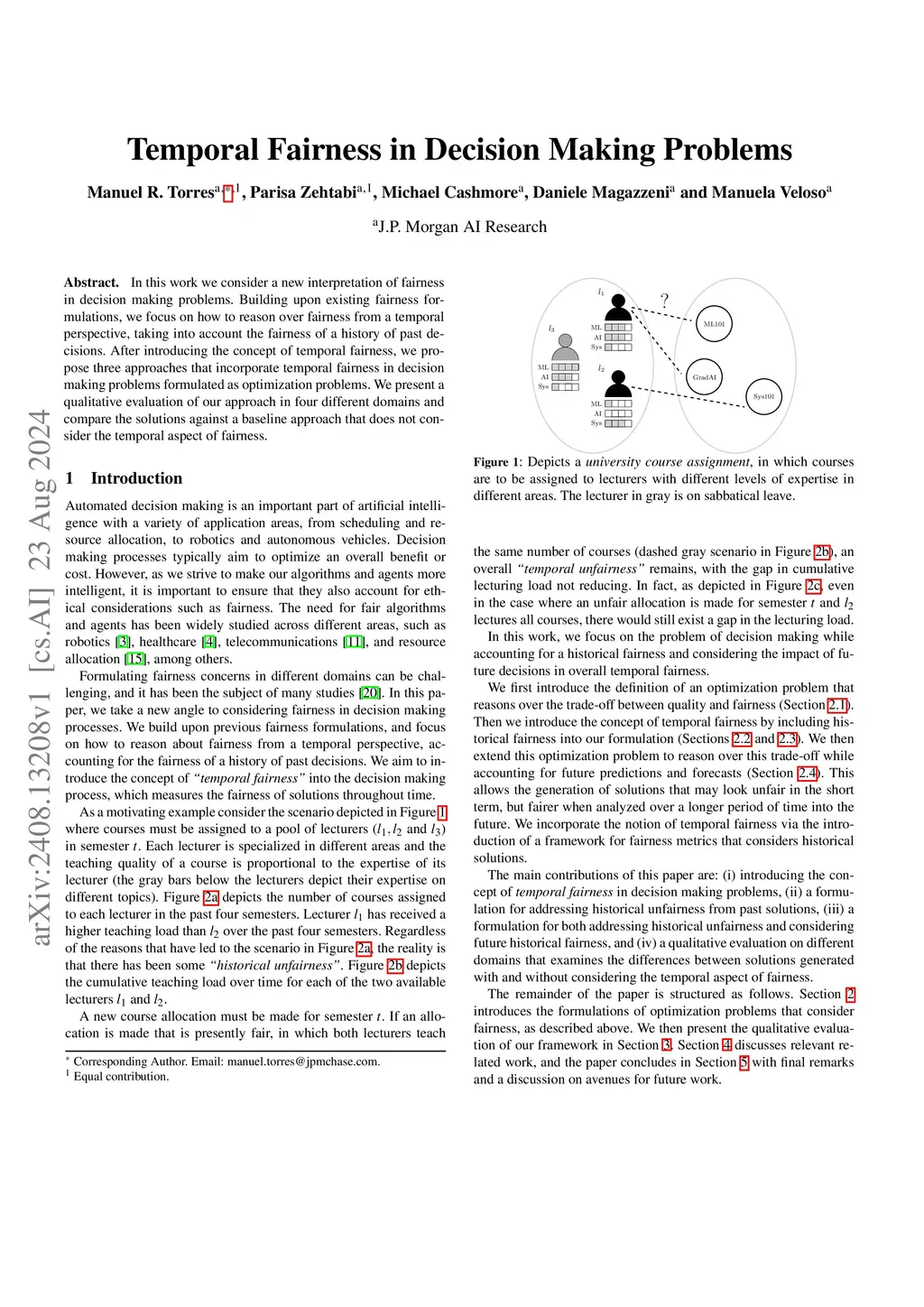 In this work we consider a new interpretation of fairness in decision making problems. Building upon existing fairness formulations, we focus on how to reason over fairness from a temporal perspective, taking into account the fairness of a history of past decisions. After introducing the concept of temporal fairness, we propose three approaches that incorporate temporal fairness in decision making problems formulated as optimization problems. We present a qualitative evaluation of our approach in four different domains and compare the solutions against a baseline approach that does not consider the temporal aspect of fairness.
