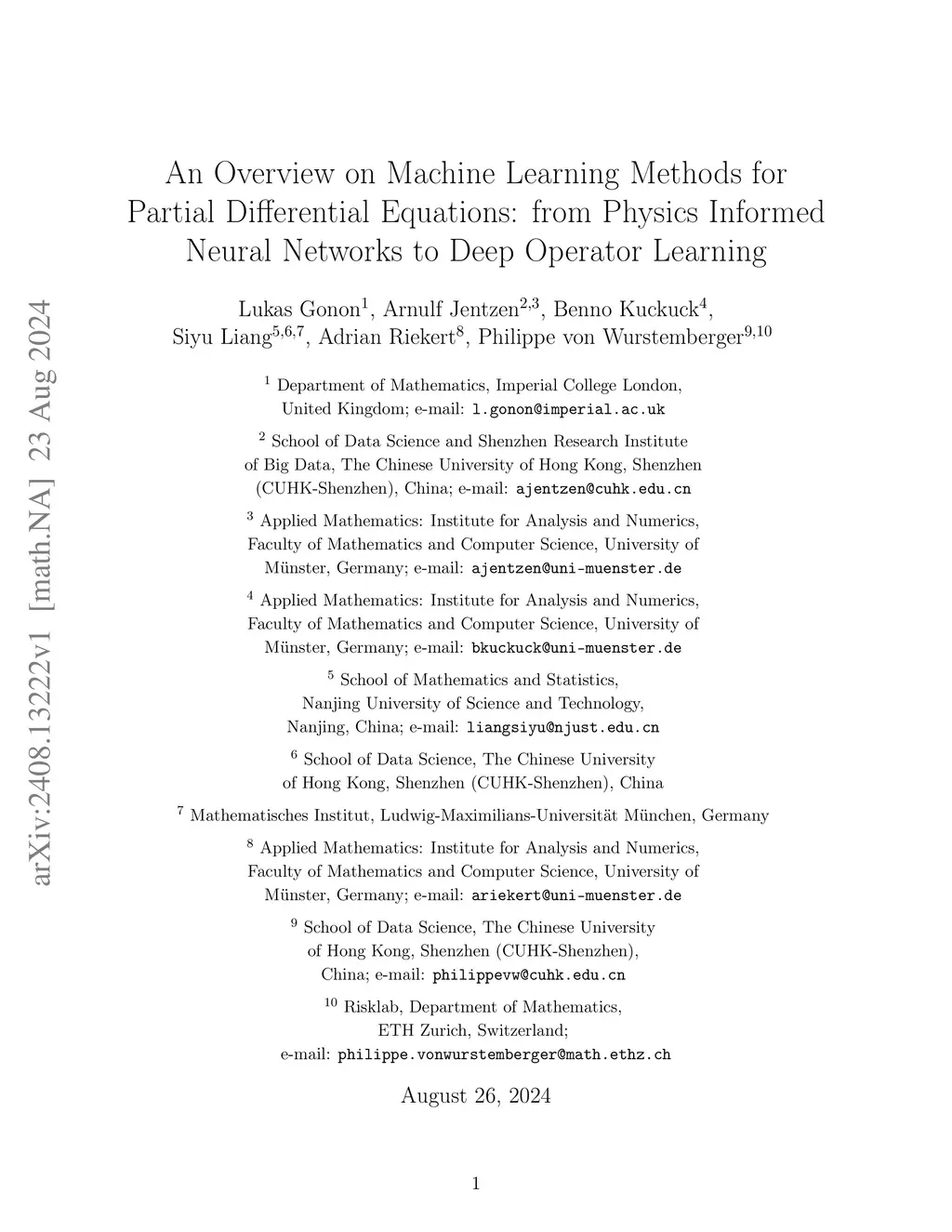 The approximation of solutions of partial differential equations (PDEs) with numerical algorithms is a central topic in applied mathematics. For many decades, various types of methods for this purpose have been developed and extensively studied. One class of methods which has received a lot of attention in recent years are machine learning-based methods, which typically involve the training of artificial neural networks (ANNs) by means of stochastic gradient descent type optimization methods. While approximation methods for PDEs using ANNs have first been proposed in the 1990s they have only gained wide popularity in the last decade with the rise of deep learning. This article aims to provide an introduction to some of these methods and the mathematical theory on which they are based. We discuss methods such as physics-informed neural networks (PINNs) and deep BSDE methods and consider several operator learning approaches.