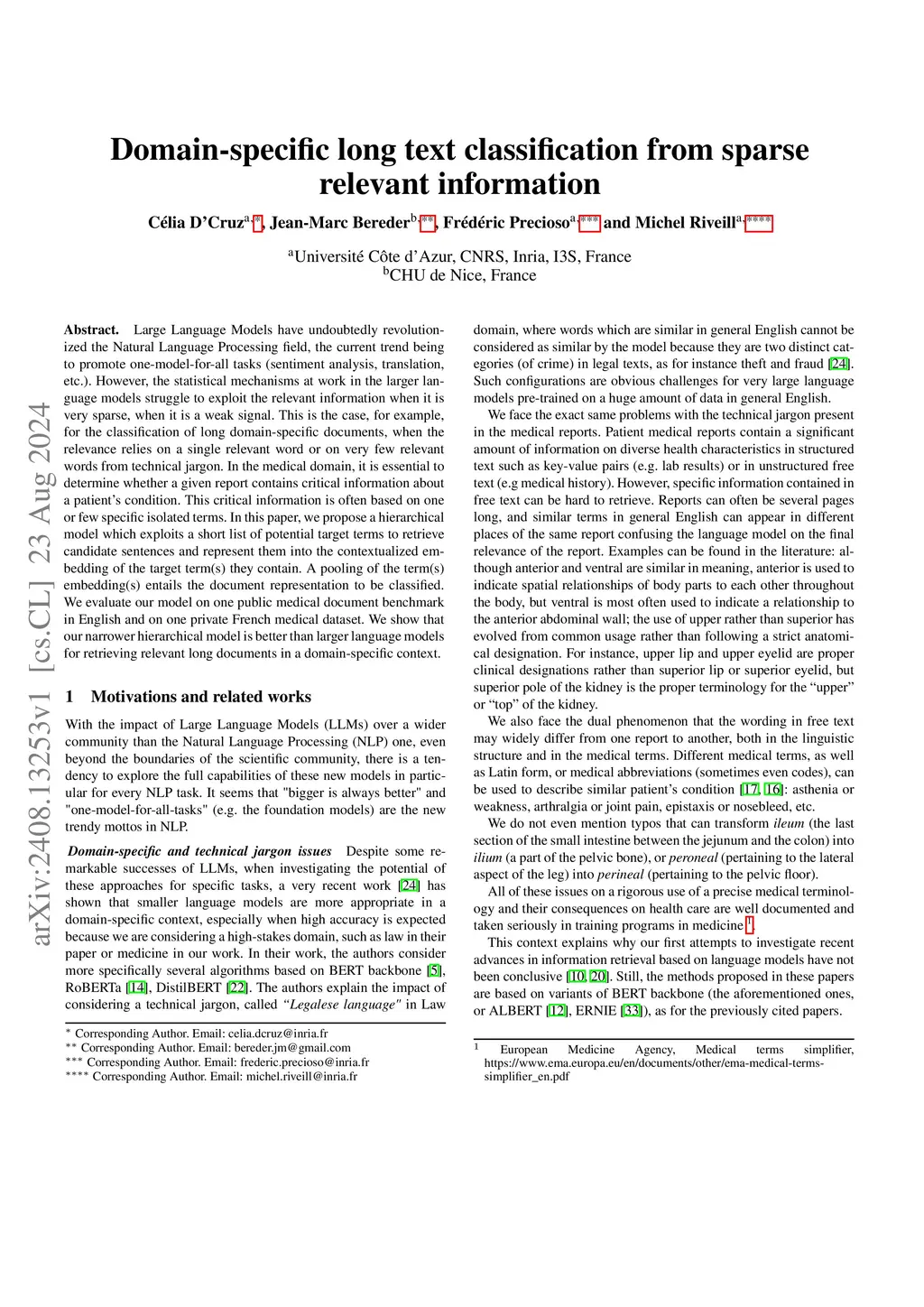 Large Language Models have undoubtedly revolutionized the Natural Language Processing field, the current trend being to promote one-model-for-all tasks (sentiment analysis, translation, etc.). However, the statistical mechanisms at work in the larger language models struggle to exploit the relevant information when it is very sparse, when it is a weak signal. This is the case, for example, for the classification of long domain-specific documents, when the relevance relies on a single relevant word or on very few relevant words from technical jargon. In the medical domain, it is essential to determine whether a given report contains critical information about a patient's condition. This critical information is often based on one or few specific isolated terms. In this paper, we propose a hierarchical model which exploits a short list of potential target terms to retrieve candidate sentences and represent them into the contextualized embedding of the target term(s) they contain. A pooling of the term(s) embedding(s) entails the document representation to be classified. We evaluate our model on one public medical document benchmark in English and on one private French medical dataset. We show that our narrower hierarchical model is better than larger language models for retrieving relevant long documents in a domain-specific context.