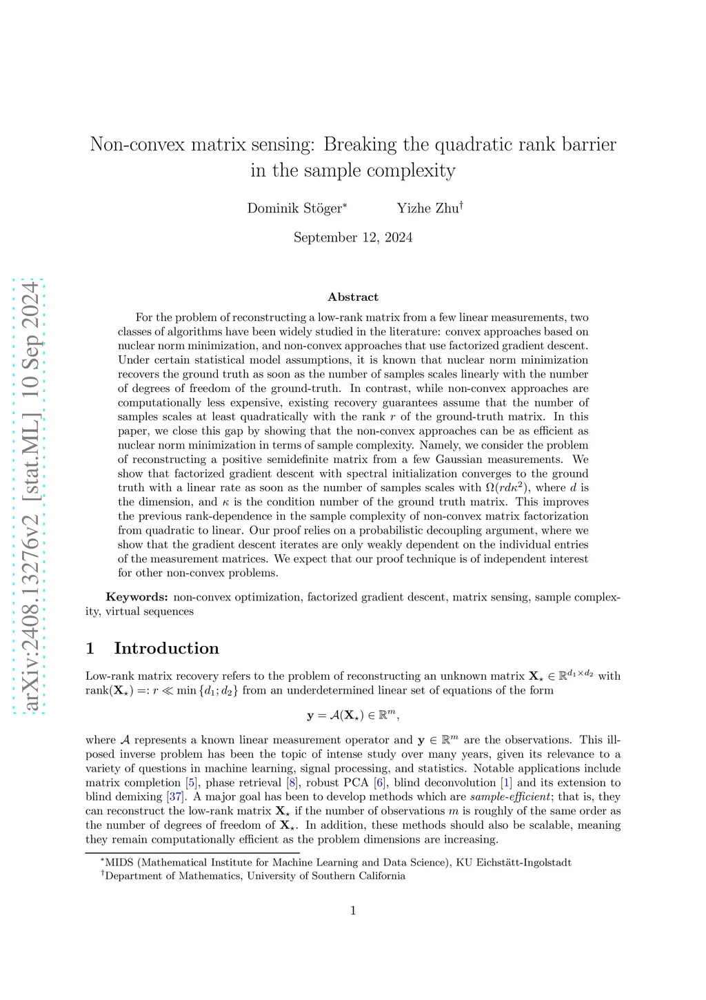 For the problem of reconstructing a low-rank matrix from a few linear measurements, two classes of algorithms have been widely studied in the literature: convex approaches based on nuclear norm minimization, and non-convex approaches that use factorized gradient descent. Under certain statistical model assumptions, it is known that nuclear norm minimization recovers the ground truth as soon as the number of samples scales linearly with the number of degrees of freedom of the ground-truth. In contrast, while non-convex approaches are computationally less expensive, existing recovery guarantees assume that the number of samples scales at least quadratically with the rank of the ground-truth matrix. In this paper, we close this gap by showing that the non-convex approaches can be as efficient as nuclear norm minimization in terms of sample complexity. Namely, we consider the problem of reconstructing a positive semidefinite matrix from a few Gaussian measurements. We show that factorized gradient descent with spectral initialization converges to the ground truth at a linear rate as soon as the number of samples scales with $ \Omega (rd\kappa^2)$, where is the dimension, and is the condition number of the ground truth matrix. This improves the previous rank-dependence in the sample complexity of non-convex matrix factorization from quadratic to linear. Furthermore, we extend our theory to the noisy setting, where we show that with noisy measurements, factorized gradient descent with spectral initialization converges to the minimax optimal error up to a factor linear in . Our proof relies on a probabilistic decoupling argument, where we show that the gradient descent iterates are only weakly dependent on the individual entries of the measurement matrices. We expect that our proof technique is of independent interest for other non-convex problems.