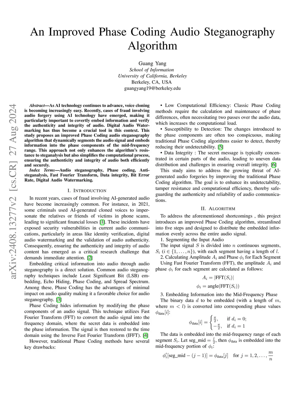 Advances in AI technology have made voice cloning increasingly accessible, leading to a rise in fraud involving AI-generated audio forgeries. This highlights the need to covertly embed information and verify the authenticity and integrity of audio. Digital Audio Watermarking plays a crucial role in this context. This study presents an improved Phase Coding audio steganography algorithm that segments the audio signal dynamically, embedding data into the mid-frequency phase components. This approach enhances resistance to steganalysis, simplifies computation, and ensures secure audio integrity.