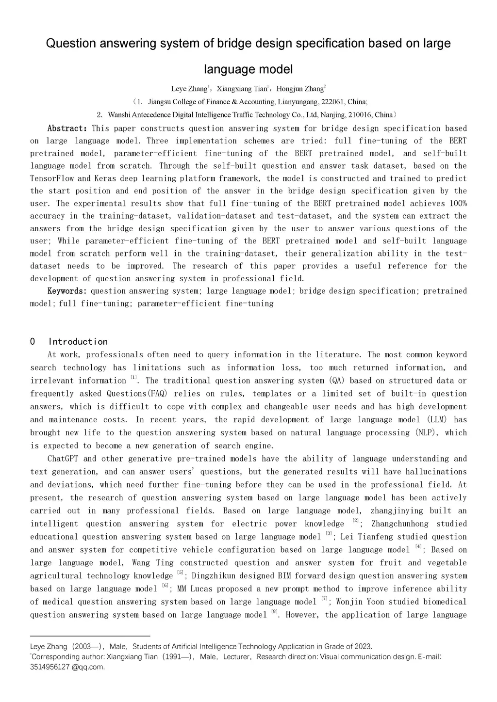 This paper constructs question answering system for bridge design specification based on large language model. Three implementation schemes are tried: full fine-tuning of the Bert pretrained model, parameter-efficient fine-tuning of the Bert pretrained model, and self-built language model from scratch. Through the self-built question and answer task dataset, based on the tensorflow and keras deep learning platform framework, the model is constructed and trained to predict the start position and end position of the answer in the bridge design specification given by the user. The experimental results show that full fine-tuning of the Bert pretrained model achieves 100% accuracy in the training-dataset, validation-dataset and test-dataset, and the system can extract the answers from the bridge design specification given by the user to answer various questions of the user; While parameter-efficient fine-tuning of the Bert pretrained model and self-built language model from scratch perform well in the training-dataset, their generalization ability in the test-dataset needs to be improved. The research of this paper provides a useful reference for the development of question answering system in professional field.