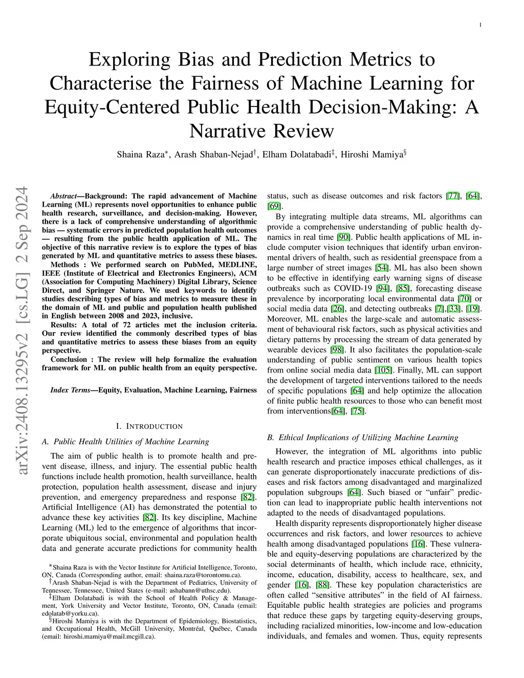 Background: The rapid advancement of Machine Learning (ML) represents novel opportunities to enhance public health research, surveillance, and decision-making. However, there is a lack of comprehensive understanding of algorithmic bias, systematic errors in predicted population health outcomes, resulting from the public health application of ML. The objective of this narrative review is to explore the types of bias generated by ML and quantitative metrics to assess these biases. Methods : We performed search on PubMed, MEDLINE, IEEE (Institute of Electrical and Electronics Engineers), ACM (Association for Computing Machinery) Digital Library, Science Direct, and Springer Nature. We used keywords to identify studies describing types of bias and metrics to measure these in the domain of ML and public and population health published in English between 2008 and 2023, inclusive. Results: A total of 72 articles met the inclusion criteria. Our review identified the commonly described types of bias and quantitative metrics to assess these biases from an equity perspective. Conclusion : The review will help formalize the evaluation framework for ML on public health from an equity perspective.