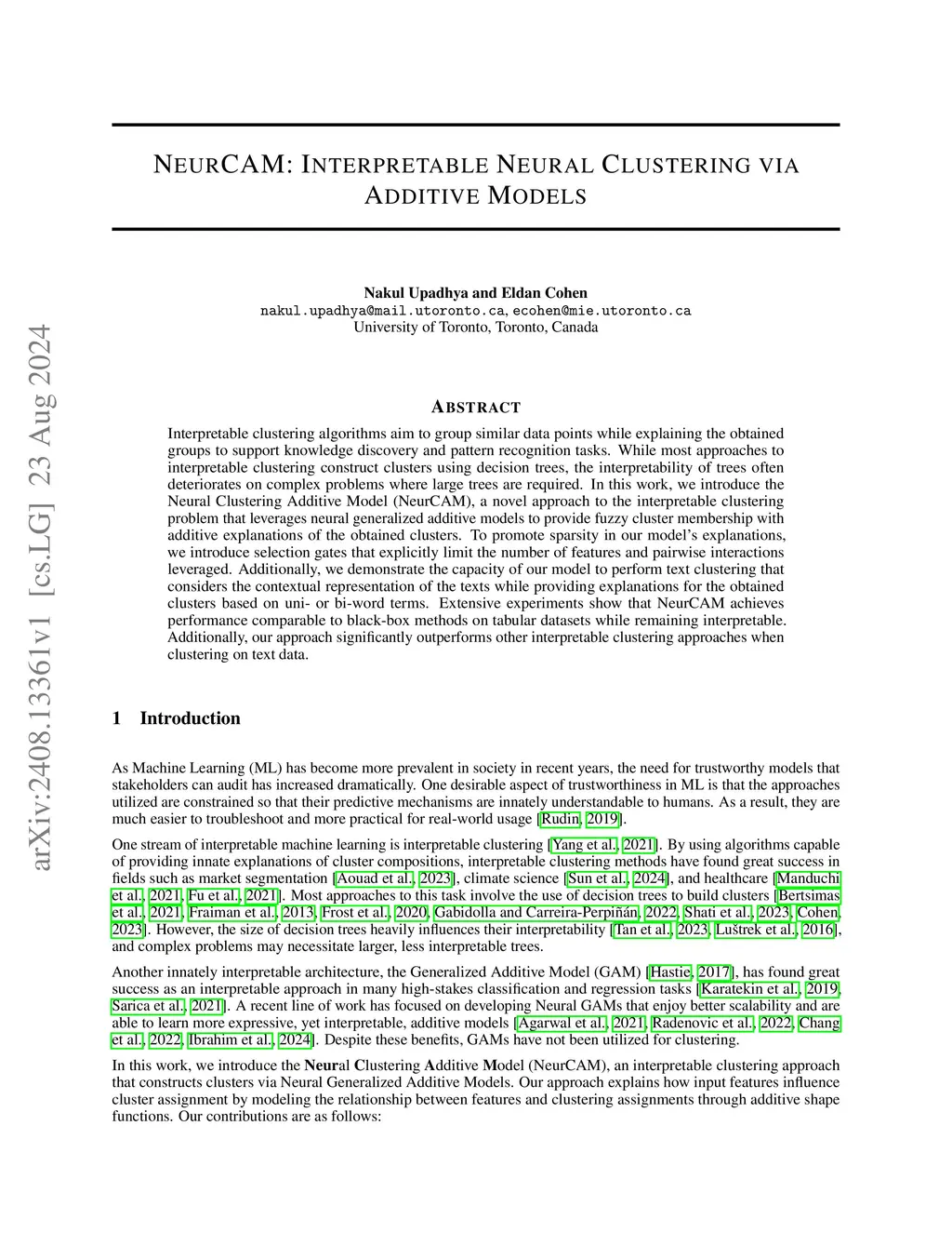 NeurCAM: Interpretable Neural Clustering via Additive Models