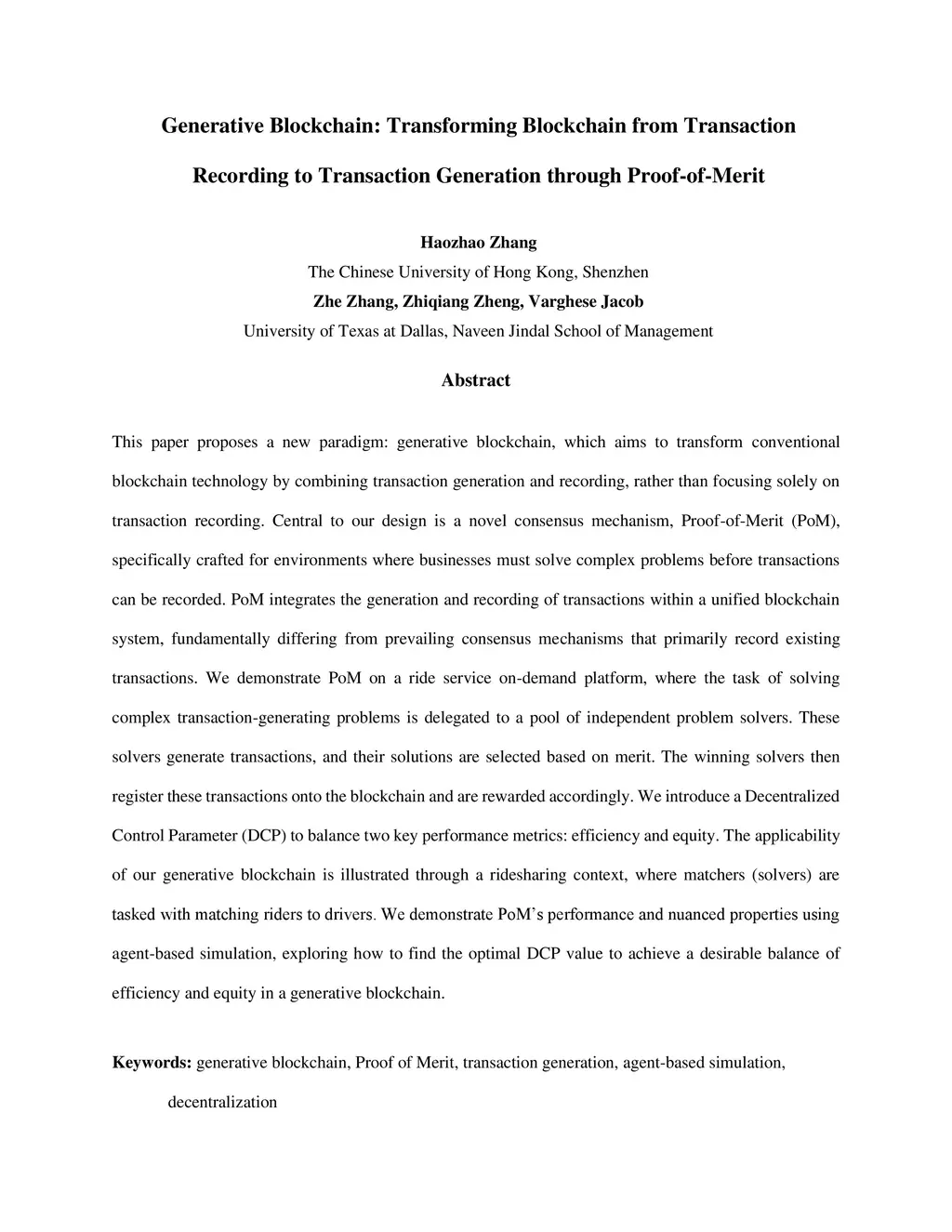 This paper proposes a new paradigm: generative blockchain, which aims to transform conventional blockchain technology by combining transaction generation and recording, rather than focusing solely on transaction recording. Central to our design is a novel consensus mechanism, Proof-of-Merit (PoM), specifically crafted for environments where businesses must solve complex problems before transactions can be recorded. PoM integrates the generation and recording of transactions within a unified blockchain system, fundamentally differing from prevailing consensus mechanisms that primarily record existing transactions. We demonstrate PoM on a ride service on-demand platform, where the task of solving complex transaction-generating problems is delegated to a pool of independent problem solvers. These solvers generate transactions, and their solutions are selected based on merit. The winning solvers then register these transactions onto the blockchain and are rewarded accordingly. We introduce a Decentralized Control Parameter (DCP) to balance two key performance metrics: efficiency and equity. The applicability of our generative blockchain is illustrated through a ridesharing context, where matchers (solvers) are tasked with matching riders to drivers. We demonstrate PoM's performance and nuanced properties using agent-based simulation, exploring how to find the optimal DCP value to achieve a desirable balance of efficiency and equity in a generative blockchain.