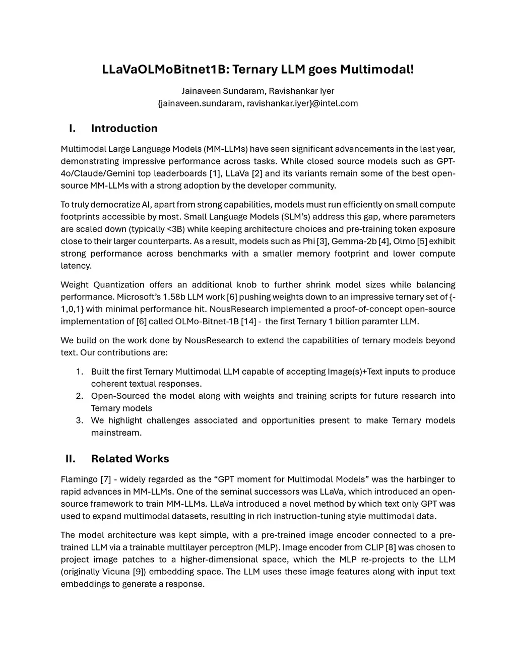 Multimodal Large Language Models (MM-LLMs) have seen significant advancements in the last year, demonstrating impressive performance across tasks. However, to truly democratize AI, models must exhibit strong capabilities and be able to run efficiently on small compute footprints accessible by most. Part of this quest, we introduce LLaVaOLMoBitnet1B - the first Ternary Multimodal LLM capable of accepting Image(s)+Text inputs to produce coherent textual responses. The model is fully open-sourced along with training scripts to encourage further research in this space. This accompanying technical report highlights the training process, evaluation details, challenges associated with ternary models and future opportunities. Link to the model: https://huggingface.co/IntelLabs/LlavaOLMoBitnet1B