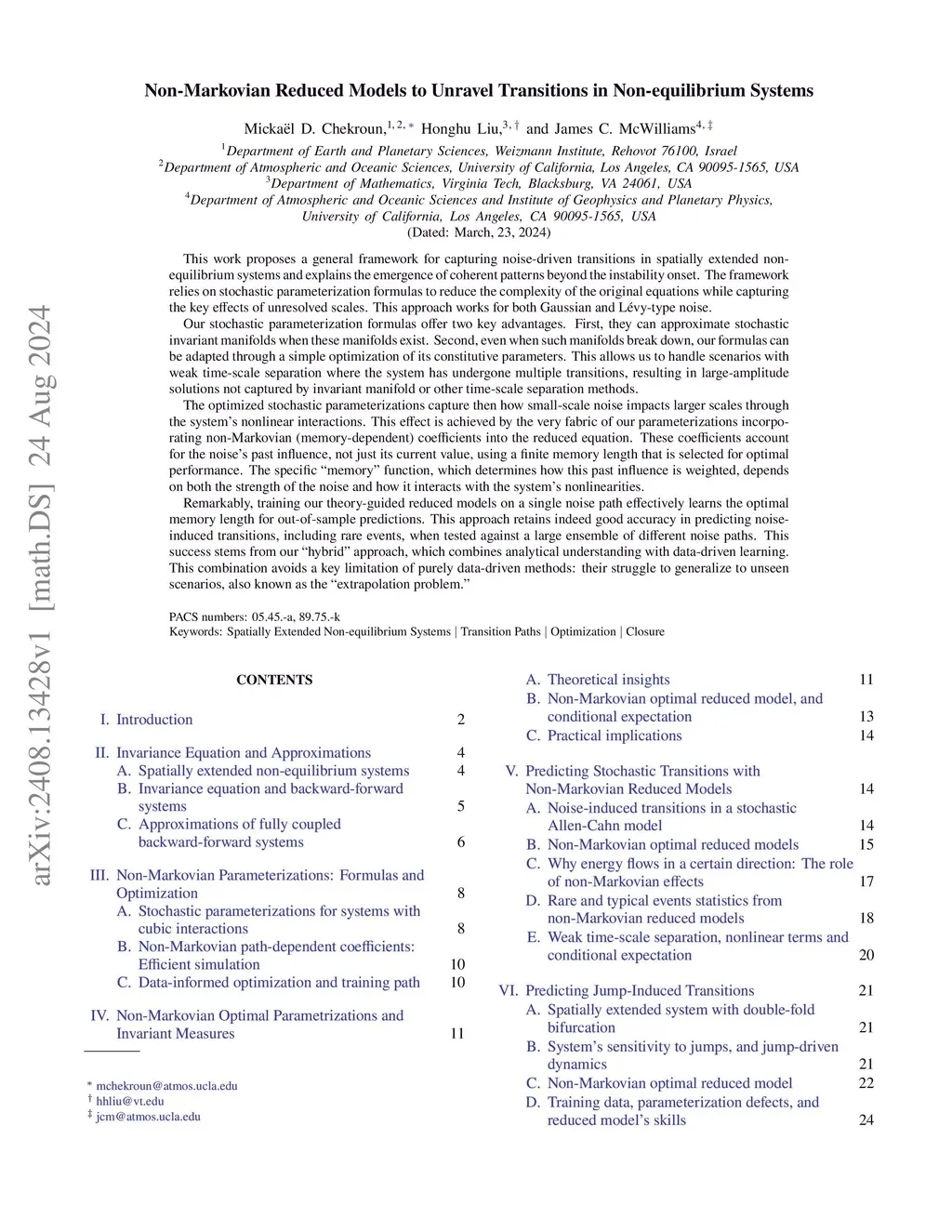 This work proposes a general framework for capturing noise-driven transitions in spatially extended non-equilibrium systems and explains the emergence of coherent patterns beyond the instability onset. The framework relies on stochastic parameterizations to reduce the original equations' complexity while capturing the key effects of unresolved scales. It works for both Gaussian and Levy-type noise. Our parameterizations offer two key advantages. First, they approximate stochastic invariant manifolds when the latter exist. Second, even when such manifolds break down, our formulas can be adapted by a simple optimization of its constitutive parameters. This allows us to handle scenarios with weak time-scale separation where the system has undergone multiple transitions, resulting in large-amplitude solutions not captured by invariant manifold or other time-scale separation methods. The optimized stochastic parameterizations capture how small-scale noise impacts larger scales through the system's nonlinear interactions. This effect is achieved by the very fabric of our parameterizations incorporating non-Markovian coefficients into the reduced equation. Such coefficients account for the noise's past influence using a finite memory length, selected for optimal performance. The specific "memory" function, which determines how this past influence is weighted, depends on the noise's strength and how it interacts with the system's nonlinearities. Remarkably, training our theory-guided reduced models on a single noise path effectively learns the optimal memory length for out-of-sample predictions, including rare events. This success stems from our "hybrid" approach, which combines analytical understanding with data-driven learning. This combination avoids a key limitation of purely data-driven methods: their struggle to generalize to unseen scenarios, also known as the "extrapolation problem."