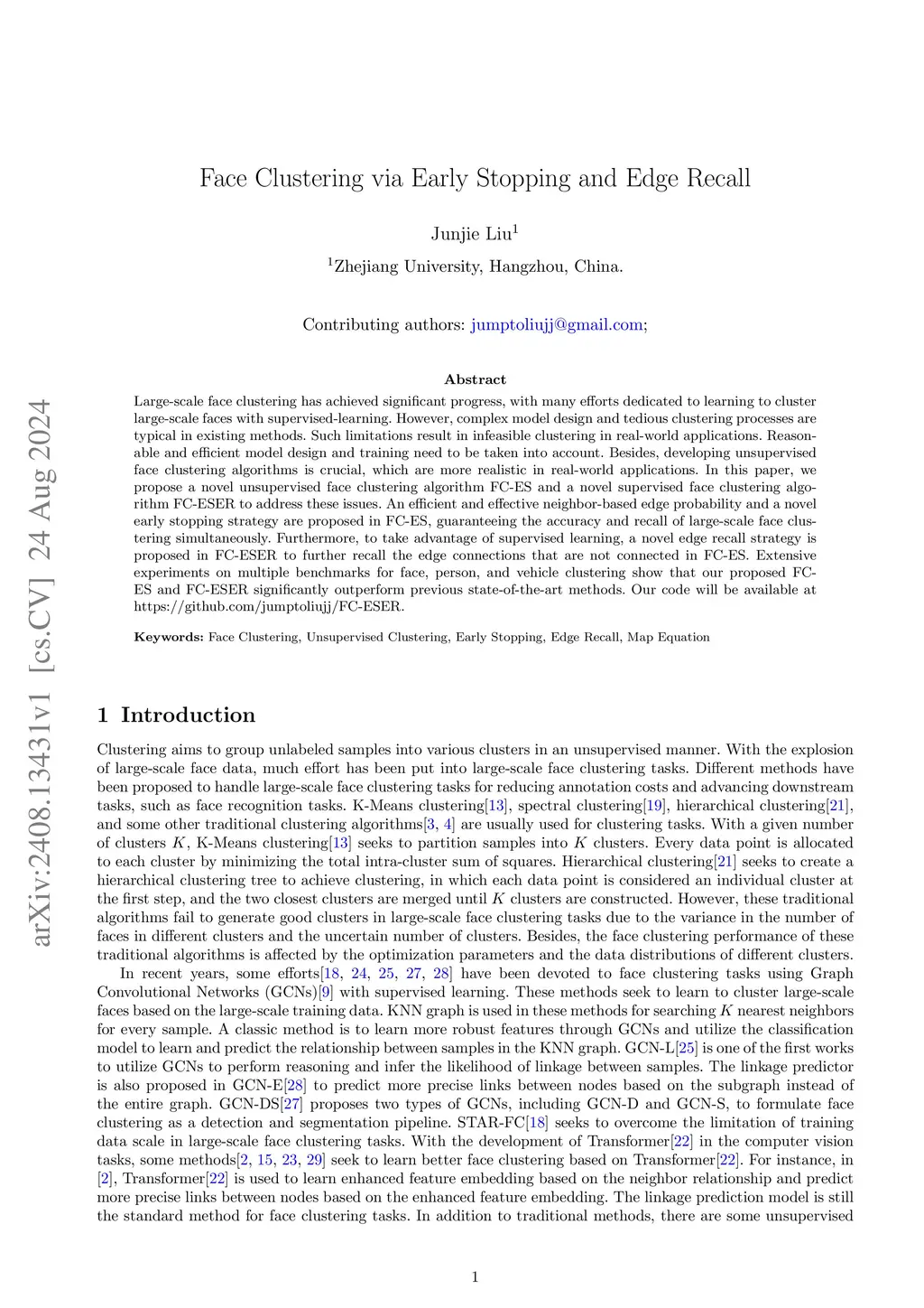 Large-scale face clustering has achieved significant progress, with many efforts dedicated to learning to cluster large-scale faces with supervised-learning. However, complex model design and tedious clustering processes are typical in existing methods. Such limitations result in infeasible clustering in real-world applications. Reasonable and efficient model design and training need to be taken into account. Besides, developing unsupervised face clustering algorithms is crucial, which are more realistic in real-world applications. In this paper, we propose a novel unsupervised face clustering algorithm FC-ES and a novel supervised face clustering algorithm FC-ESER to address these issues. An efficient and effective neighbor-based edge probability and a novel early stopping strategy are proposed in FC-ES, guaranteeing the accuracy and recall of large-scale face clustering simultaneously. Furthermore, to take advantage of supervised learning, a novel edge recall strategy is proposed in FC-ESER to further recall the edge connections that are not connected in FC-ES. Extensive experiments on multiple benchmarks for face, person, and vehicle clustering show that our proposed FC-ES and FC-ESER significantly outperform previous state-of-the-art methods. Our code will be available atthis https URL.