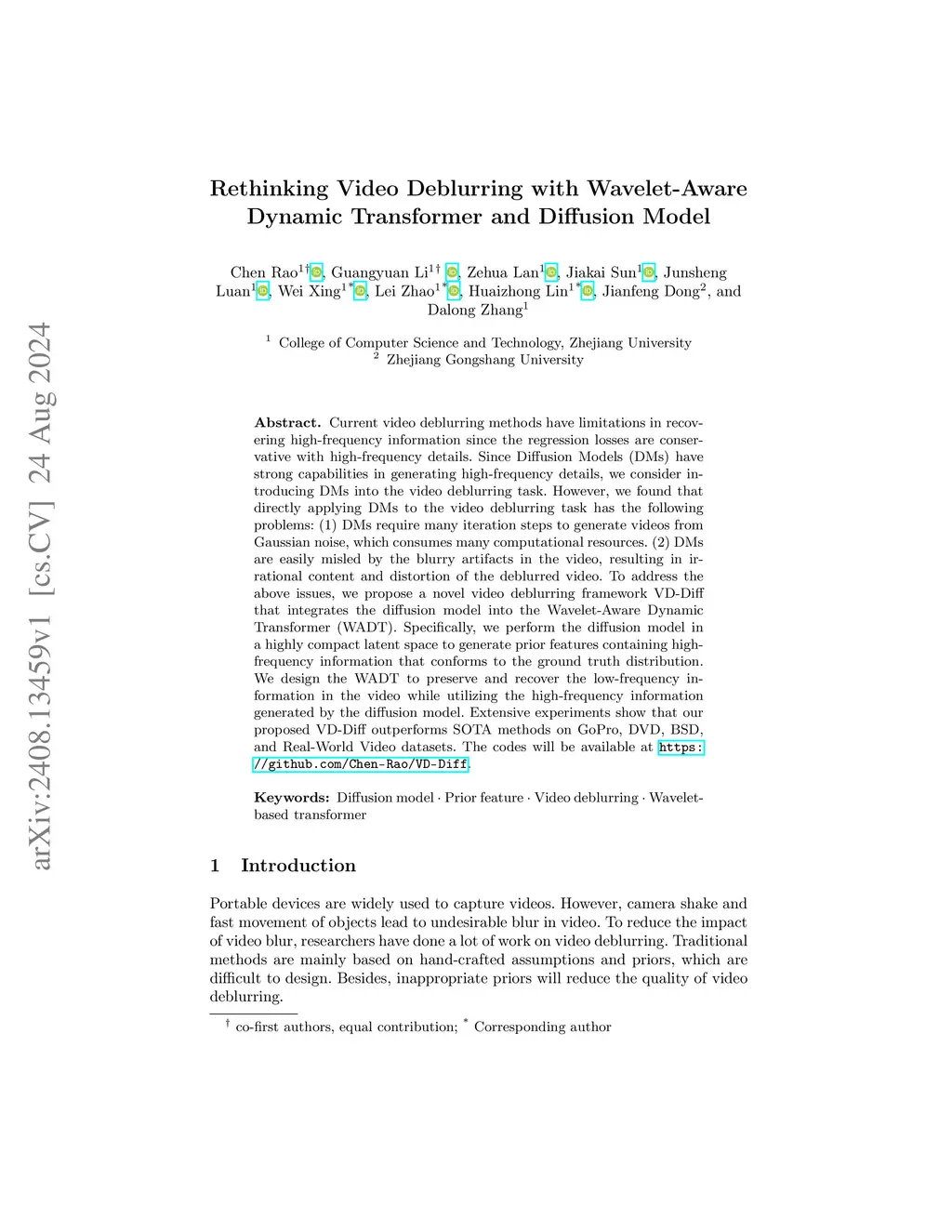 Current video deblurring methods have limitations in recovering high-frequency information since the regression losses are conservative with high-frequency details. Since Diffusion Models (DMs) have strong capabilities in generating high-frequency details, we consider introducing DMs into the video deblurring task. However, we found that directly applying DMs to the video deblurring task has the following problems: (1) DMs require many iteration steps to generate videos from Gaussian noise, which consumes many computational resources. (2) DMs are easily misled by the blurry artifacts in the video, resulting in irrational content and distortion of the deblurred video. To address the above issues, we propose a novel video deblurring framework VD-Diff that integrates the diffusion model into the Wavelet-Aware Dynamic Transformer (WADT). Specifically, we perform the diffusion model in a highly compact latent space to generate prior features containing high-frequency information that conforms to the ground truth distribution. We design the WADT to preserve and recover the low-frequency information in the video while utilizing the high-frequency information generated by the diffusion model. Extensive experiments show that our proposed VD-Diff outperforms SOTA methods on GoPro, DVD, BSD, and Real-World Video datasets.