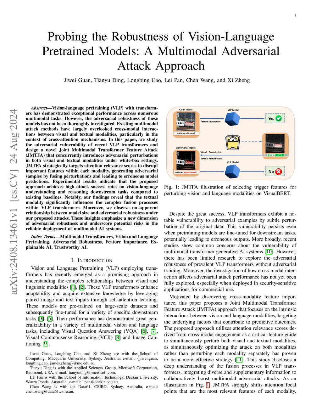 Vision-language pretraining (VLP) with transformers has demonstrated exceptional performance across numerous multimodal tasks. However, the adversarial robustness of these models has not been thoroughly investigated. Existing multimodal attack methods have largely overlooked cross-modal interactions between visual and textual modalities, particularly in the context of cross-attention mechanisms. In this paper, we study the adversarial vulnerability of recent VLP transformers and design a novel Joint Multimodal Transformer Feature Attack (JMTFA) that concurrently introduces adversarial perturbations in both visual and textual modalities under white-box settings. JMTFA strategically targets attention relevance scores to disrupt important features within each modality, generating adversarial samples by fusing perturbations and leading to erroneous model predictions. Experimental results indicate that the proposed approach achieves high attack success rates on vision-language understanding and reasoning downstream tasks compared to existing baselines. Notably, our findings reveal that the textual modality significantly influences the complex fusion processes within VLP transformers. Moreover, we observe no apparent relationship between model size and adversarial robustness under our proposed attacks. These insights emphasize a new dimension of adversarial robustness and underscore potential risks in the reliable deployment of multimodal AI systems.