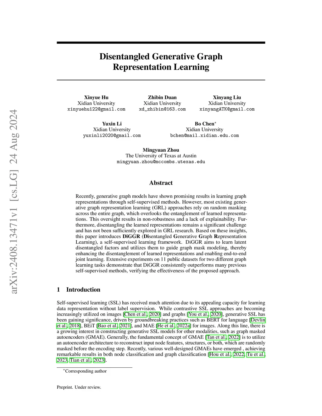 Recently, generative graph models have shown promising results in learning graph representations through self-supervised methods. However, most existing generative graph representation learning (GRL) approaches rely on random masking across the entire graph, which overlooks the entanglement of learned representations. This oversight results in non-robustness and a lack of explainability. Furthermore, disentangling the learned representations remains a significant challenge and has not been sufficiently explored in GRL research. Based on these insights, this paper introduces DiGGR (Disentangled Generative Graph Representation Learning), a self-supervised learning framework. DiGGR aims to learn latent disentangled factors and utilizes them to guide graph mask modeling, thereby enhancing the disentanglement of learned representations and enabling end-to-end joint learning. Extensive experiments on 11 public datasets for two different graph learning tasks demonstrate that DiGGR consistently outperforms many previous self-supervised methods, verifying the effectiveness of the proposed approach.