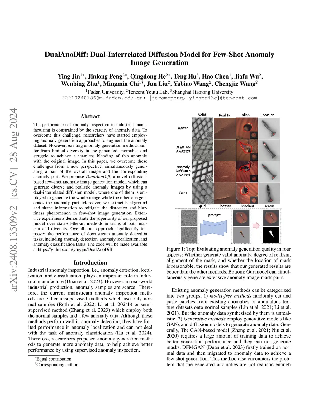 The performance of anomaly inspection in industrial manufacturing is constrained by the scarcity of anomaly data. To overcome this challenge, researchers have started employing anomaly generation approaches to augment the anomaly dataset. However, existing anomaly generation methods suffer from limited diversity in the generated anomalies and struggle to achieve a seamless blending of this anomaly with the original image. Moreover, the generated mask is usually not aligned with the generated anomaly. In this paper, we overcome these challenges from a new perspective, simultaneously generating a pair of the overall image and the corresponding anomaly part. We propose DualAnoDiff, a novel diffusion-based few-shot anomaly image generation model, which can generate diverse and realistic anomaly images by using a dual-interrelated diffusion model, where one of them is employed to generate the whole image while the other one generates the anomaly part. Moreover, we extract background and shape information to mitigate the distortion and blurriness phenomenon in few-shot image generation. Extensive experiments demonstrate the superiority of our proposed model over state-of-the-art methods in terms of diversity, realism and the accuracy of mask. Overall, our approach significantly improves the performance of downstream anomaly inspection tasks, including anomaly detection, anomaly localization, and anomaly classification tasks.