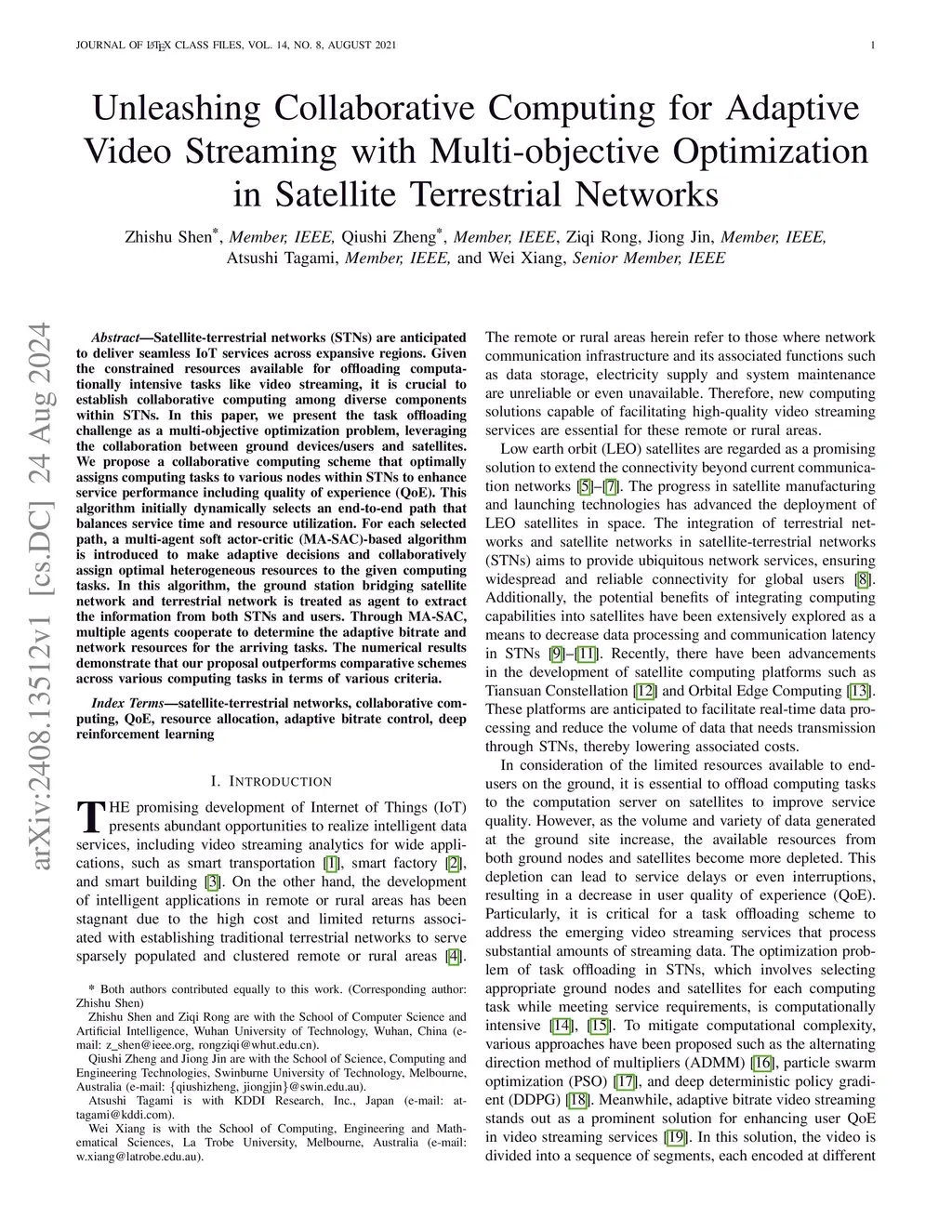 Satellite-terrestrial networks (STNs) are anticipated to deliver seamless IoT services across expansive regions. Given the constrained resources available for offloading computationally intensive tasks like video streaming, it is crucial to establish collaborative computing among diverse components within STNs. In this paper, we present the task offloading challenge as a multi-objective optimization problem, leveraging the collaboration between ground devices/users and satellites. We propose a collaborative computing scheme that optimally assigns computing tasks to various nodes within STNs to enhance service performance including quality of experience (QoE). This algorithm initially dynamically selects an end-to-end path that balances service time and resource utilization. For each selected path, a multi-agent soft actor-critic (MA-SAC)-based algorithm is introduced to make adaptive decisions and collaboratively assign optimal heterogeneous resources to the given computing tasks. In this algorithm, the ground station bridging satellite network and terrestrial network is treated as agent to extract the information from both STNs and users. Through MA-SAC, multiple agents cooperate to determine the adaptive bitrate and network resources for the arriving tasks. The numerical results demonstrate that our proposal outperforms comparative schemes across various computing tasks in terms of various criteria.