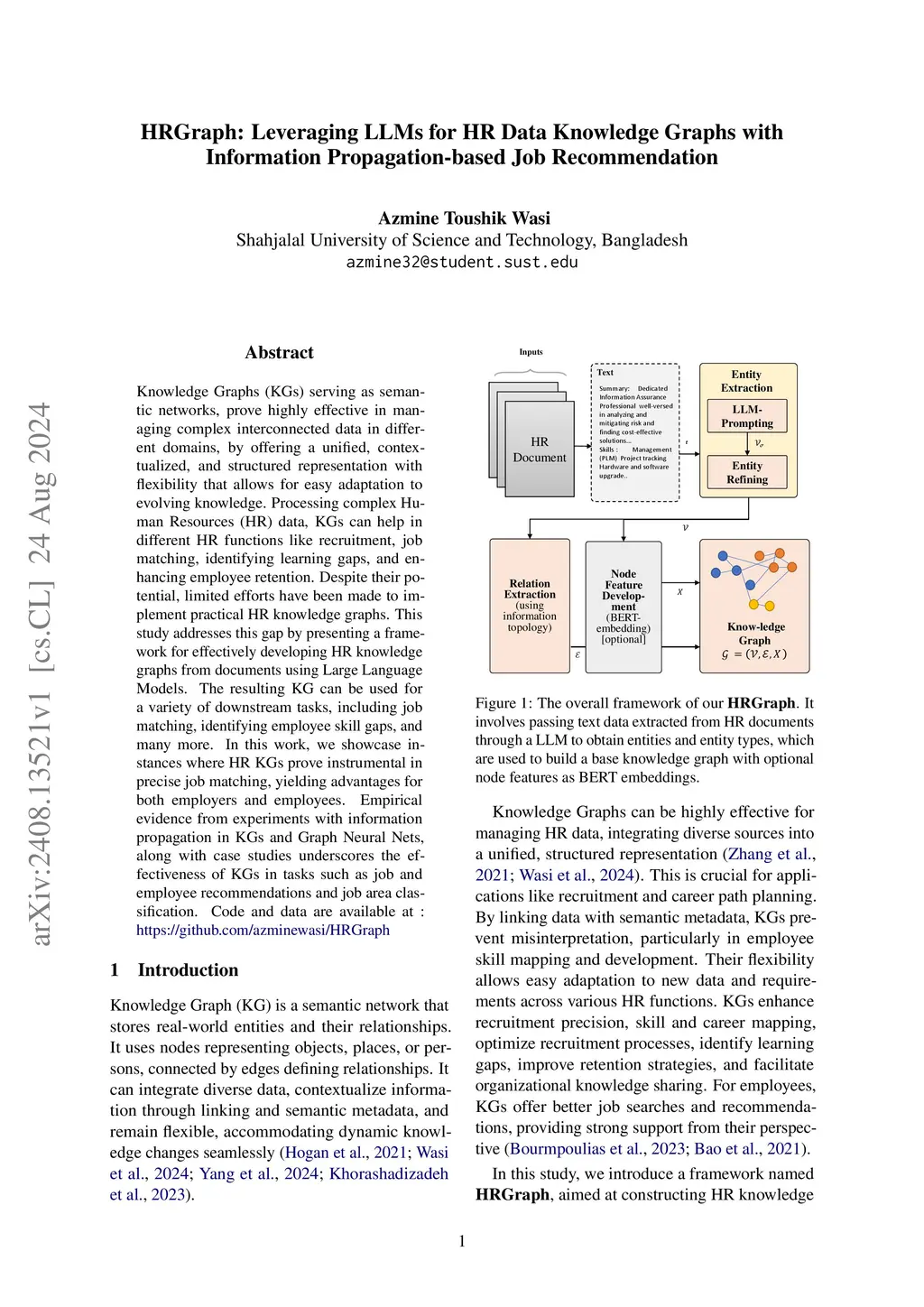 Knowledge Graphs (KGs) serving as semantic networks, prove highly effective in managing complex interconnected data in different domains, by offering a unified, contextualized, and structured representation with flexibility that allows for easy adaptation to evolving knowledge. Processing complex Human Resources (HR) data, KGs can help in different HR functions like recruitment, job matching, identifying learning gaps, and enhancing employee retention. Despite their potential, limited efforts have been made to implement practical HR knowledge graphs. This study addresses this gap by presenting a framework for effectively developing HR knowledge graphs from documents using Large Language Models. The resulting KG can be used for a variety of downstream tasks, including job matching, identifying employee skill gaps, and many more. In this work, we showcase instances where HR KGs prove instrumental in precise job matching, yielding advantages for both employers and employees. Empirical evidence from experiments with information propagation in KGs and Graph Neural Nets, along with case studies underscores the effectiveness of KGs in tasks such as job and employee recommendations and job area classification. Code and data are available at : https://github.com/azminewasi/HRGraph