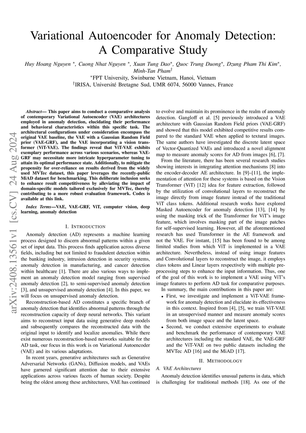 This paper aims to conduct a comparative analysis of contemporary Variational Autoencoder (VAE) architectures employed in anomaly detection, elucidating their performance and behavioral characteristics within this specific task. The architectural configurations under consideration encompass the original VAE baseline, the VAE with a Gaussian Random Field prior (VAE-GRF), and the VAE incorporating a vision transformer (ViT-VAE). The findings reveal that ViT-VAE exhibits exemplary performance across various scenarios, whereas VAE-GRF may necessitate more intricate hyperparameter tuning to attain its optimal performance state. Additionally, to mitigate the propensity for over-reliance on results derived from the widely used MVTec dataset, this paper leverages the recently-public MiAD dataset for benchmarking. This deliberate inclusion seeks to enhance result competitiveness by alleviating the impact of domain-specific models tailored exclusively for MVTec, thereby contributing to a more robust evaluation framework. Codes is available at https://github.com/endtheme123/VAE-compare.git.