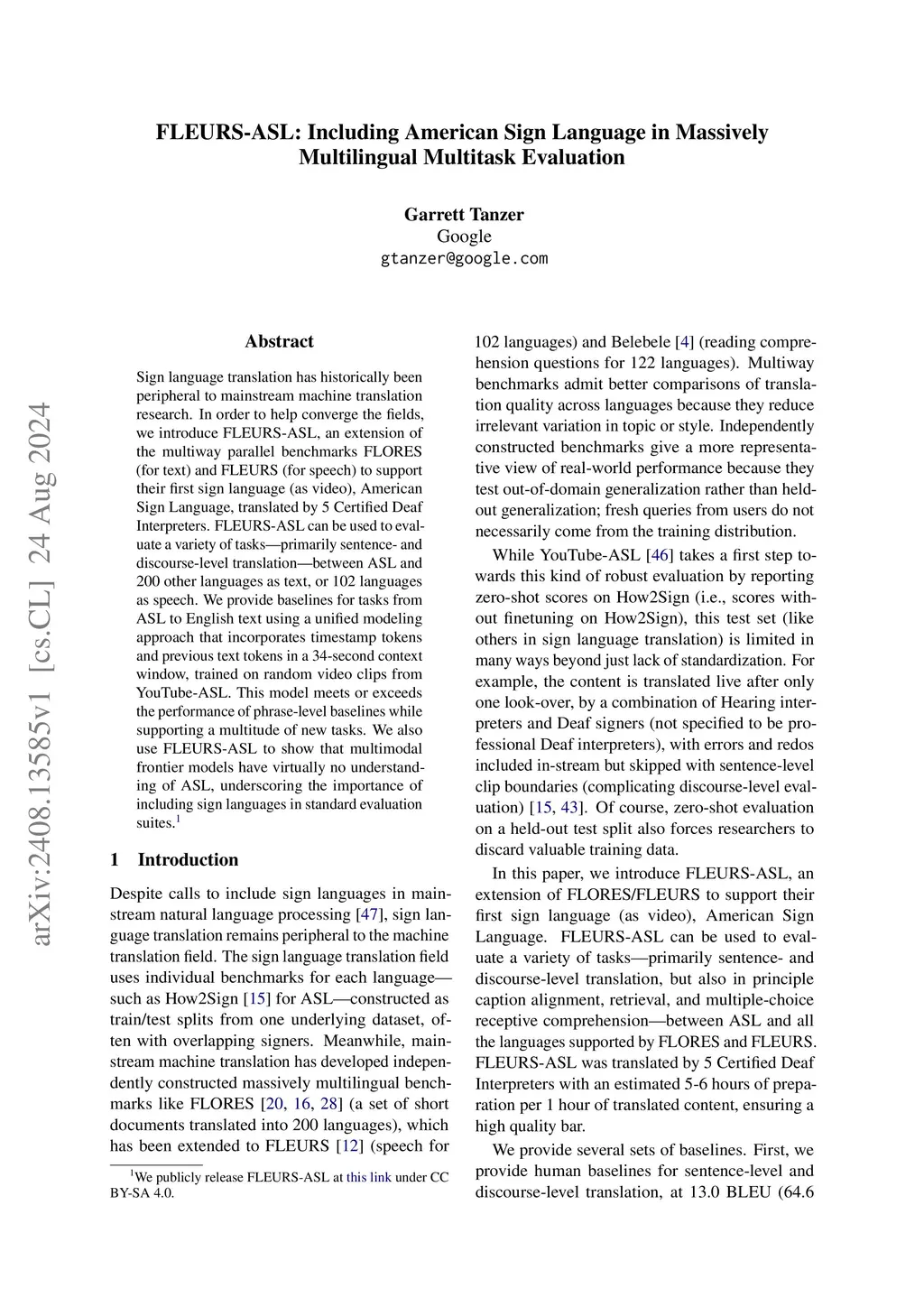 Sign language translation has historically been peripheral to mainstream machine translation research. In order to help converge the fields, we introduce FLEURS-ASL, an extension of the multiway parallel benchmarks FLORES (for text) and FLEURS (for speech) to support their first sign language (as video), American Sign Language, translated by 5 Certified Deaf Interpreters. FLEURS-ASL can be used to evaluate a variety of tasks -- primarily sentence- and discourse-level translation -- between ASL and 200 other languages as text, or 102 languages as speech. We provide baselines for tasks from ASL to English text using a unified modeling approach that incorporates timestamp tokens and previous text tokens in a 34-second context window, trained on random video clips from YouTube-ASL. This model meets or exceeds the performance of phrase-level baselines while supporting a multitude of new tasks. We also use FLEURS-ASL to show that multimodal frontier models have virtually no understanding of ASL, underscoring the importance of including sign languages in standard evaluation suites.