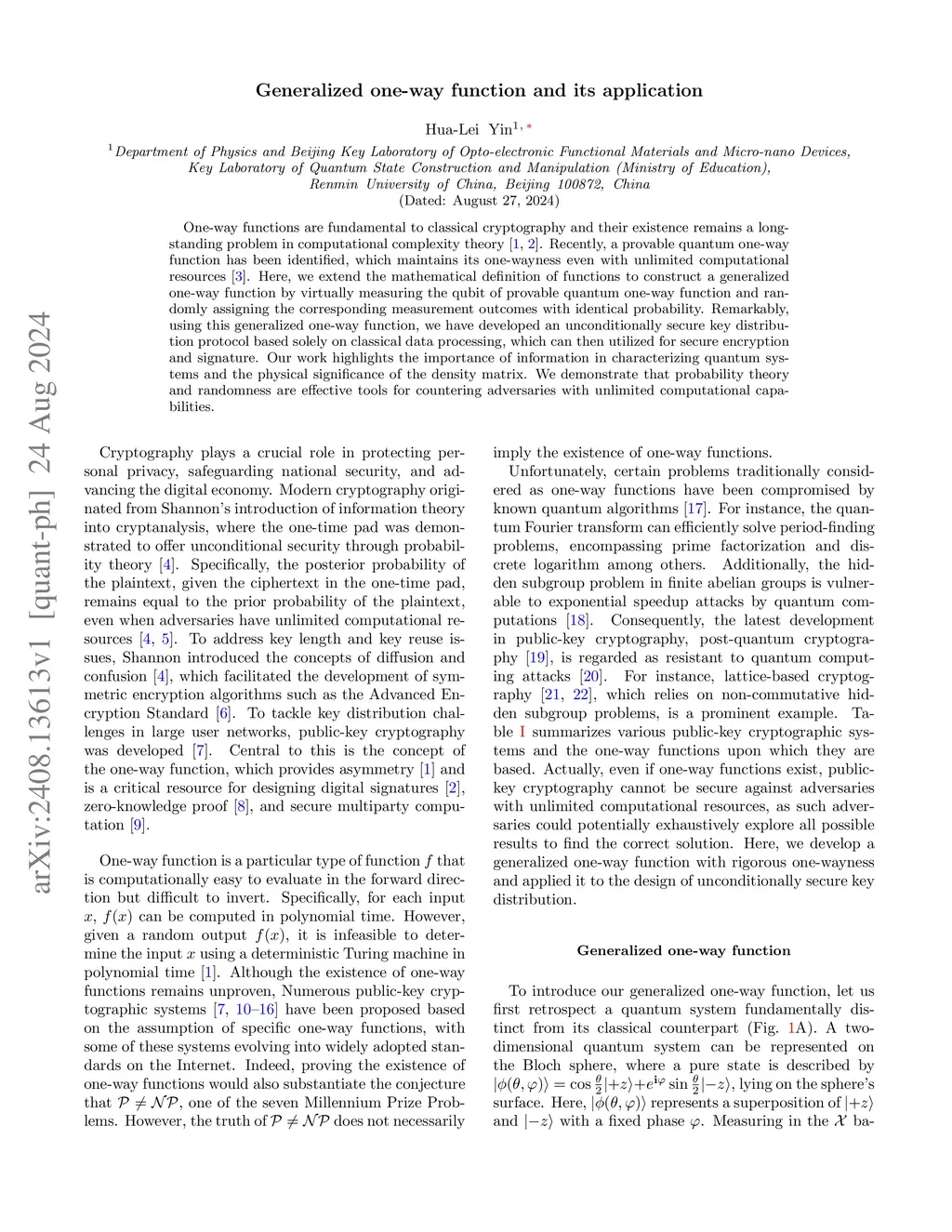 One-way functions are fundamental to classical cryptography and their existence remains a longstanding problem in computational complexity theory. Recently, a provable quantum one-way function has been identified, which maintains its one-wayness even with unlimited computational resources. Here, we extend the mathematical definition of functions to construct a generalized one-way function by virtually measuring the qubit of provable quantum one-way function and randomly assigning the corresponding measurement outcomes with identical probability. Remarkably, using this generalized one-way function, we have developed an unconditionally secure key distribution protocol based solely on classical data processing, which can then utilized for secure encryption and signature. Our work highlights the importance of information in characterizing quantum systems and the physical significance of the density matrix. We demonstrate that probability theory and randomness are effective tools for countering adversaries with unlimited computational capabilities.