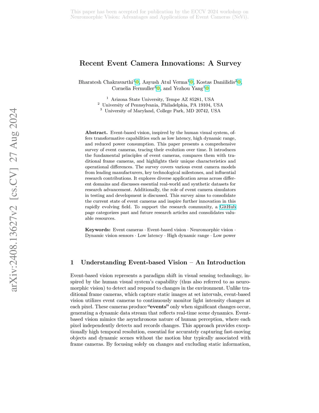 Event-based vision, inspired by the human visual system, offers transformative capabilities such as low latency, high dynamic range, and reduced power consumption. This paper presents a comprehensive survey of event cameras, tracing their evolution over time. It introduces the fundamental principles of event cameras, compares them with traditional frame cameras, and highlights their unique characteristics and operational differences. The survey covers various event camera models from leading manufacturers, key technological milestones, and influential research contributions. It explores diverse application areas across different domains and discusses essential real-world and synthetic datasets for research advancement. Additionally, the role of event camera simulators in testing and development is discussed. This survey aims to consolidate the current state of event cameras and inspire further innovation in this rapidly evolving field. To support the research community, a GitHub page (https://github.com/chakravarthi589/Event-based-Vision_Resources) categorizes past and future research articles and consolidates valuable resources.