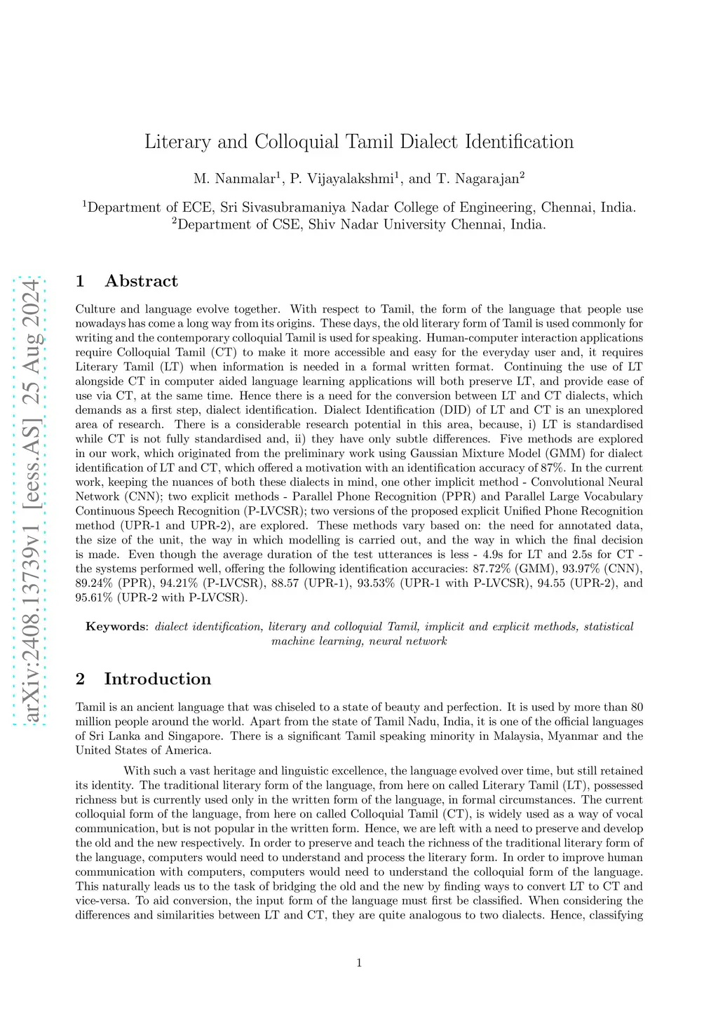 Culture and language evolve together. The old literary form of Tamil is used commonly for writing and the contemporary colloquial Tamil is used for speaking. Human-computer interaction applications require Colloquial Tamil (CT) to make it more accessible and easy for the everyday user and, it requires Literary Tamil (LT) when information is needed in a formal written format. Continuing the use of LT alongside CT in computer aided language learning applications will both preserve LT, and provide ease of use via CT, at the same time. Hence there is a need for the conversion between LT and CT dialects, which demands as a first step, dialect identification. Dialect Identification (DID) of LT and CT is an unexplored area of research. In the current work, keeping the nuances of both these dialects in mind, five methods are explored which include two implicit methods - Gaussian Mixture Model (GMM) and Convolutional Neural Network (CNN); two explicit methods - Parallel Phone Recognition (PPR) and Parallel Large Vocabulary Continuous Speech Recognition (P-LVCSR); two versions of the proposed explicit Unified Phone Recognition method (UPR-1 and UPR-2). These methods vary based on: the need for annotated data, the size of the unit, the way in which modelling is carried out, and the way in which the final decision is made. Even though the average duration of the test utterances is less - 4.9s for LT and 2.5s for CT - the systems performed well, offering the following identification accuracies: 87.72% (GMM), 93.97% (CNN), 89.24% (PPR), 94.21% (P-LVCSR), 88.57% (UPR-1), 93.53% (UPR-1 with P-LVCSR), 94.55% (UPR-2), and 95.61% (UPR-2 with P-LVCSR).