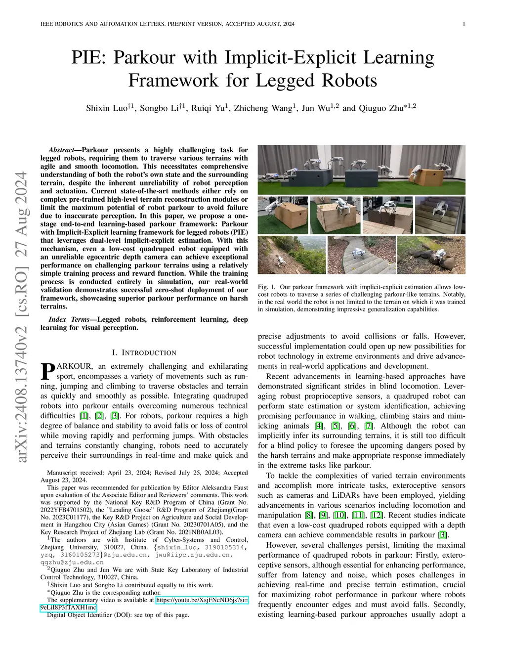 PIE: Parkour with Implicit-Explicit Learning Framework for Legged Robots
