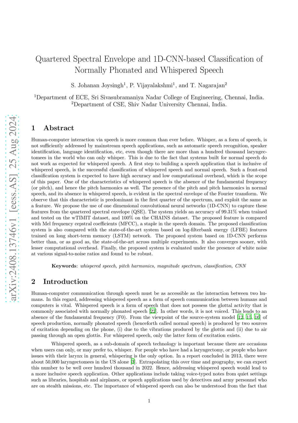 Whisper, as a form of speech, is not sufficiently addressed by mainstream speech applications. This is due to the fact that systems built for normal speech do not work as expected for whispered speech. A first step to building a speech application that is inclusive of whispered speech, is the successful classification of whispered speech and normal speech. Such a front-end classification system is expected to have high accuracy and low computational overhead, which is the scope of this paper. One of the characteristics of whispered speech is the absence of the fundamental frequency (or pitch), and hence the pitch harmonics as well. The presence of the pitch and pitch harmonics in normal speech, and its absence in whispered speech, is evident in the spectral envelope of the Fourier transform. We observe that this characteristic is predominant in the first quarter of the spectrum, and exploit the same as a feature. We propose the use of one dimensional convolutional neural networks (1D-CNN) to capture these features from the quartered spectral envelope (QSE). The system yields an accuracy of 99.31% when trained and tested on the wTIMIT dataset, and 100% on the CHAINS dataset. The proposed feature is compared with Mel frequency cepstral coefficients (MFCC), a staple in the speech domain. The proposed classification system is also compared with the state-of-the-art system based on log-filterbank energy (LFBE) features trained on long short-term memory (LSTM) network. The proposed system based on 1D-CNN performs better than, or as good as, the state-of-the-art across multiple experiments. It also converges sooner, with lesser computational overhead. Finally, the proposed system is evaluated under the presence of white noise at various signal-to-noise ratios and found to be robust.