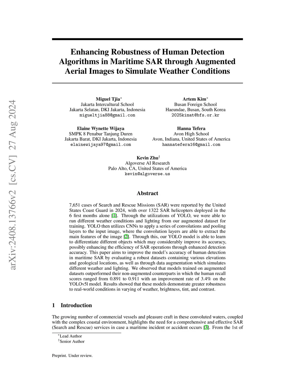 7,651 cases of Search and Rescue Missions (SAR) were reported by the United States Coast Guard in 2024, with over 1322 SAR helicopters deployed in the 6 first months alone. Through the utilizations of YOLO, we were able to run different weather conditions and lighting from our augmented dataset for training. YOLO then utilizes CNNs to apply a series of convolutions and pooling layers to the input image, where the convolution layers are able to extract the main features of the image. Through this, our YOLO model is able to learn to differentiate different objects which may considerably improve its accuracy, possibly enhancing the efficiency of SAR operations through enhanced detection accuracy. This paper aims to improve the model's accuracy of human detection in maritime SAR by evaluating a robust datasets containing various elevations and geological locations, as well as through data augmentation which simulates different weather and lighting. We observed that models trained on augmented datasets outperformed their non-augmented counterparts in which the human recall scores ranged from 0.891 to 0.911 with an improvement rate of 3.4\% on the YOLOv5l model. Results showed that these models demonstrate greater robustness to real-world conditions in varying of weather, brightness, tint, and contrast.