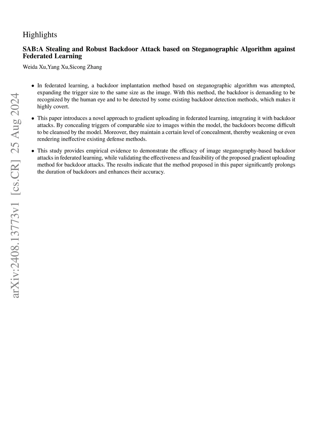 Federated learning, an innovative network architecture designed to safeguard user privacy, is gaining widespread adoption in the realm of technology. However, given the existence of backdoor attacks in federated learning, exploring the security of federated learning is significance. Nevertheless, the backdoors investigated in current federated learning research can be readily detected by human inspection or resisted by detection algorithms. Accordingly, a new goal has been set to develop stealing and robust federated learning backdoor attacks. In this paper, we introduce a novel approach, SAB, tailored specifically for backdoor attacks in federated learning, presenting an alternative gradient updating mechanism. SAB attack based on steganographic algorithm, using image steganographic algorithm to build a full-size trigger to improve the accuracy of backdoors and use multiple loss joint computation to produce triggers. SAB exhibits smaller distances to benign samples and greater imperceptibility to the human eye. As such, our triggers are capable of mitigating or evading specific backdoor defense methods. In SAB, the bottom-95\% method is applied to extend the lifespan of backdoor attacks. It updates the gradient on minor value points to reduce the probability of being cleaned. Finally, the generalization of backdoors is enhanced with Sparse-update to improve the backdoor accuracy.