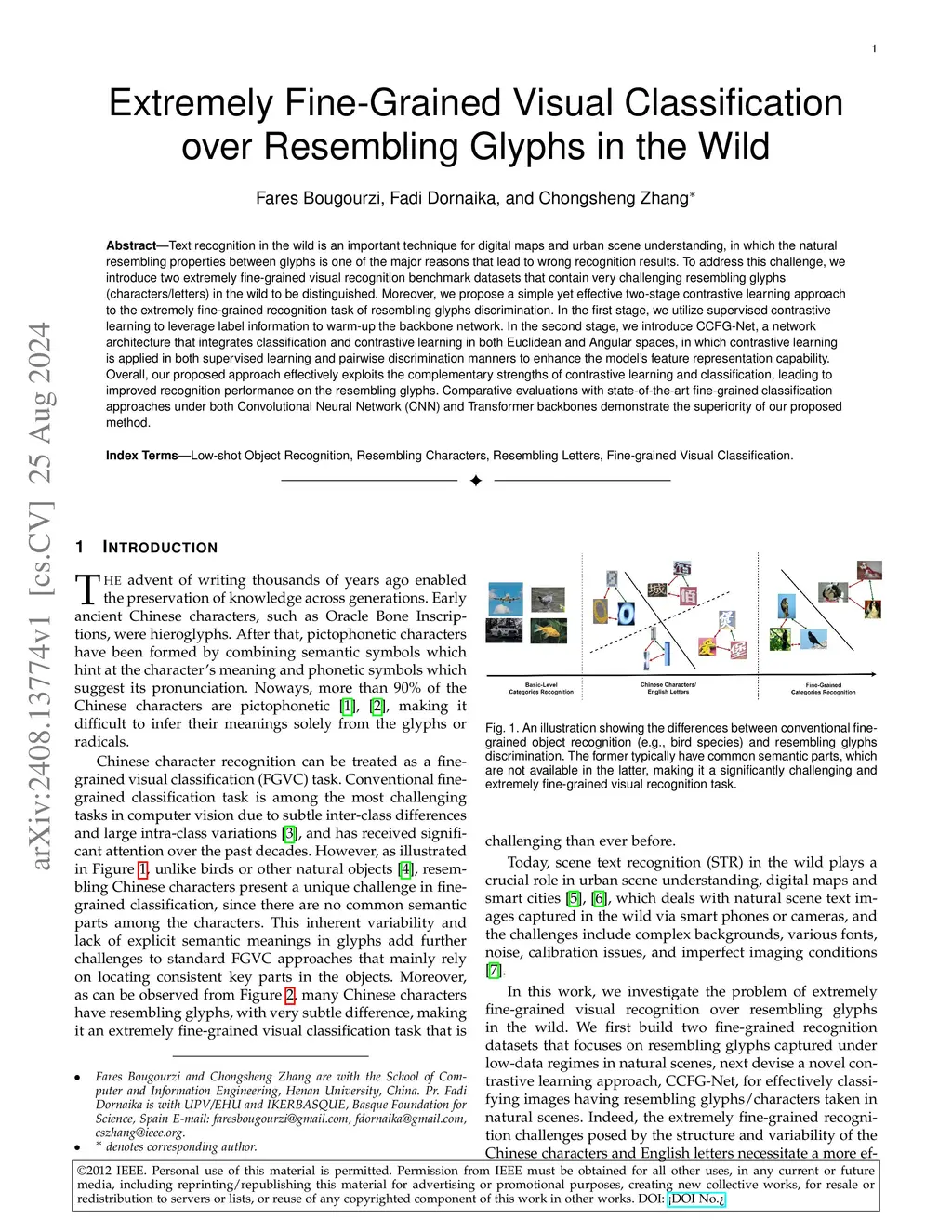Text recognition in the wild is an important technique for digital maps and urban scene understanding, in which the natural resembling properties between glyphs is one of the major reasons that lead to wrong recognition results. To address this challenge, we introduce two extremely fine-grained visual recognition benchmark datasets that contain very challenging resembling glyphs (characters/letters) in the wild to be distinguished. Moreover, we propose a simple yet effective two-stage contrastive learning approach to the extremely fine-grained recognition task of resembling glyphs discrimination. In the first stage, we utilize supervised contrastive learning to leverage label information to warm-up the backbone network. In the second stage, we introduce CCFG-Net, a network architecture that integrates classification and contrastive learning in both Euclidean and Angular spaces, in which contrastive learning is applied in both supervised learning and pairwise discrimination manners to enhance the model's feature representation capability. Overall, our proposed approach effectively exploits the complementary strengths of contrastive learning and classification, leading to improved recognition performance on the resembling glyphs. Comparative evaluations with state-of-the-art fine-grained classification approaches under both Convolutional Neural Network (CNN) and Transformer backbones demonstrate the superiority of our proposed method.