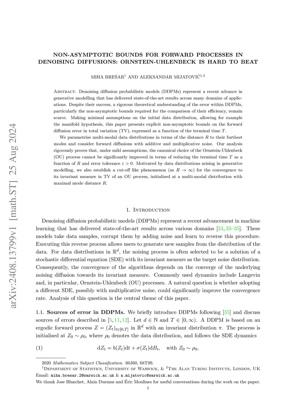 Denoising diffusion probabilistic models (DDPMs) represent a recent advance in generative modelling that has delivered state-of-the-art results across many domains of applications. Despite their success, a rigorous theoretical understanding of the error within DDPMs, particularly the non-asymptotic bounds required for the comparison of their efficiency, remain scarce. Making minimal assumptions on the initial data distribution, allowing for example the manifold hypothesis, this paper presents explicit non-asymptotic bounds on the forward diffusion error in total variation (TV), expressed as a function of the terminal time .We parametrise multi-modal data distributions in terms of the distance to their furthest modes and consider forward diffusions with additive and multiplicative noise. Our analysis rigorously proves that, under mild assumptions, the canonical choice of the Ornstein-Uhlenbeck (OU) process cannot be significantly improved in terms of reducing the terminal time as a function of and error tolerance . Motivated by data distributions arising in generative modelling, we also establish a cut-off like phenomenon (as ) for the convergence to its invariant measure in TV of an OU process, initialized at a multi-modal distribution with maximal mode distance .