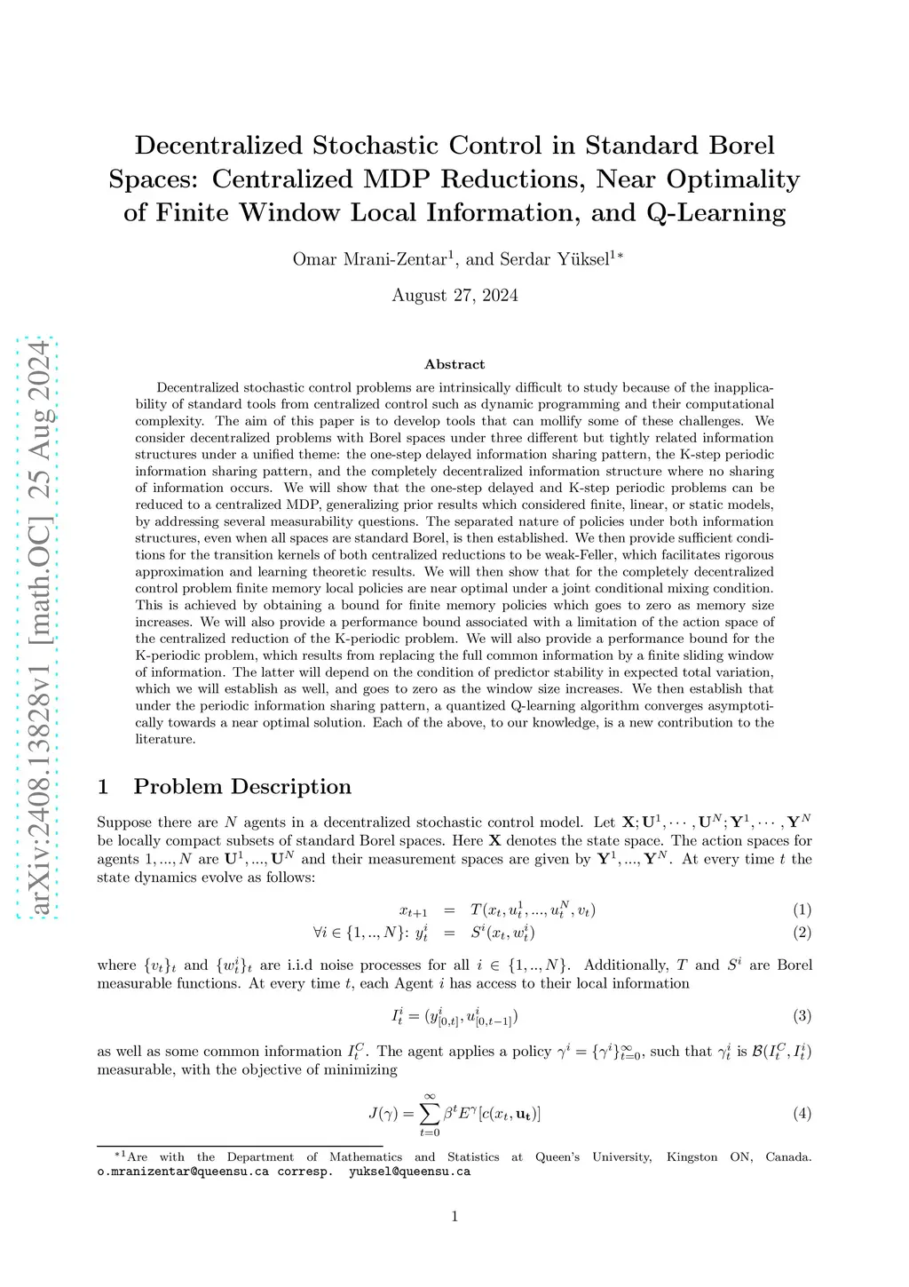Decentralized stochastic control problems are intrinsically difficult to study because of the inapplicability of standard tools from centralized control such as dynamic programming and the resulting computational complexity. In this paper, we address some of these challenges for decentralized stochastic control with Borel spaces under three different but tightly related information structures under a unified theme: the one-step delayed information sharing pattern, the K-step periodic information sharing pattern, and the completely decentralized information structure where no sharing of information occurs. We will show that the one-step delayed and K-step periodic problems can be reduced to a centralized MDP, generalizing prior results which considered finite, linear, or static models, by addressing several measurability questions. The separated nature of policies under both information structures is then established. We then provide sufficient conditions for the transition kernels of both centralized reductions to be weak-Feller, which facilitates rigorous approximation and learning theoretic results. We will then show that for the completely decentralized control problem finite memory local policies are near optimal under a joint conditional mixing condition. This is achieved by obtaining a bound for finite memory policies which goes to zero as memory size increases. We will also provide a performance bound for the K-periodic problem, which results from replacing the full common information by a finite sliding window of information. The latter will depend on the condition of predictor stability in expected total variation, which we will establish. We finally show that under the periodic information sharing pattern, a quantized Q-learning algorithm converges asymptotically towards a near optimal solution. Each of the above, to our knowledge, is a new contribution to the literature.