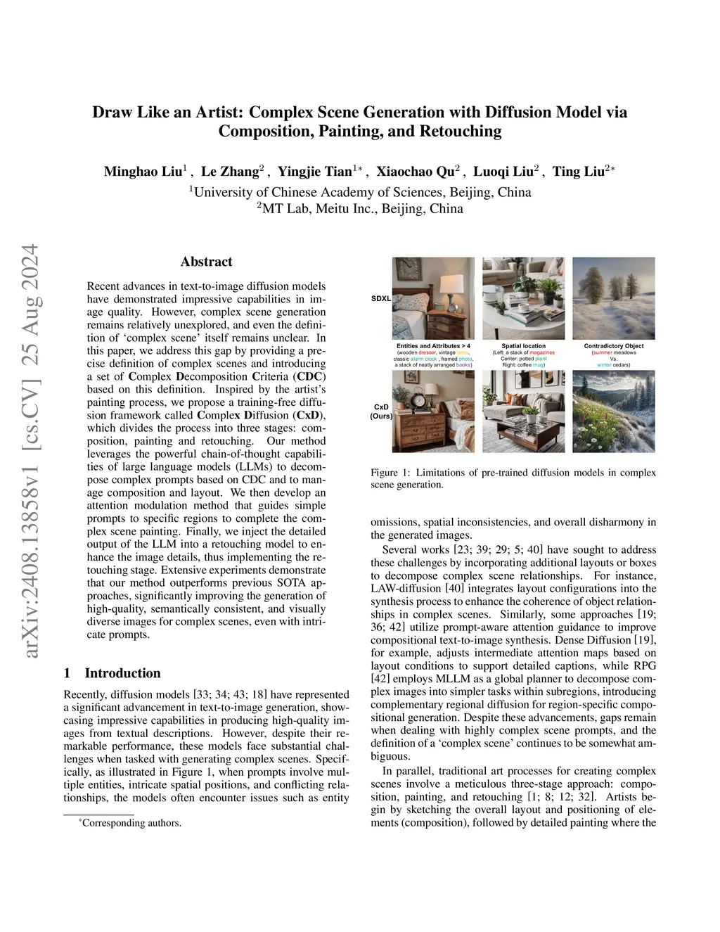Recent advances in text-to-image diffusion models have demonstrated impressive capabilities in image quality. However, complex scene generation remains relatively unexplored, and even the definition of `complex scene' itself remains unclear. In this paper, we address this gap by providing a precise definition of complex scenes and introducing a set of Complex Decomposition Criteria (CDC) based on this definition. Inspired by the artists painting process, we propose a training-free diffusion framework called Complex Diffusion (CxD), which divides the process into three stages: composition, painting, and retouching. Our method leverages the powerful chain-of-thought capabilities of large language models (LLMs) to decompose complex prompts based on CDC and to manage composition and layout. We then develop an attention modulation method that guides simple prompts to specific regions to complete the complex scene painting. Finally, we inject the detailed output of the LLM into a retouching model to enhance the image details, thus implementing the retouching stage. Extensive experiments demonstrate that our method outperforms previous SOTA approaches, significantly improving the generation of high-quality, semantically consistent, and visually diverse images for complex scenes, even with intricate prompts.
