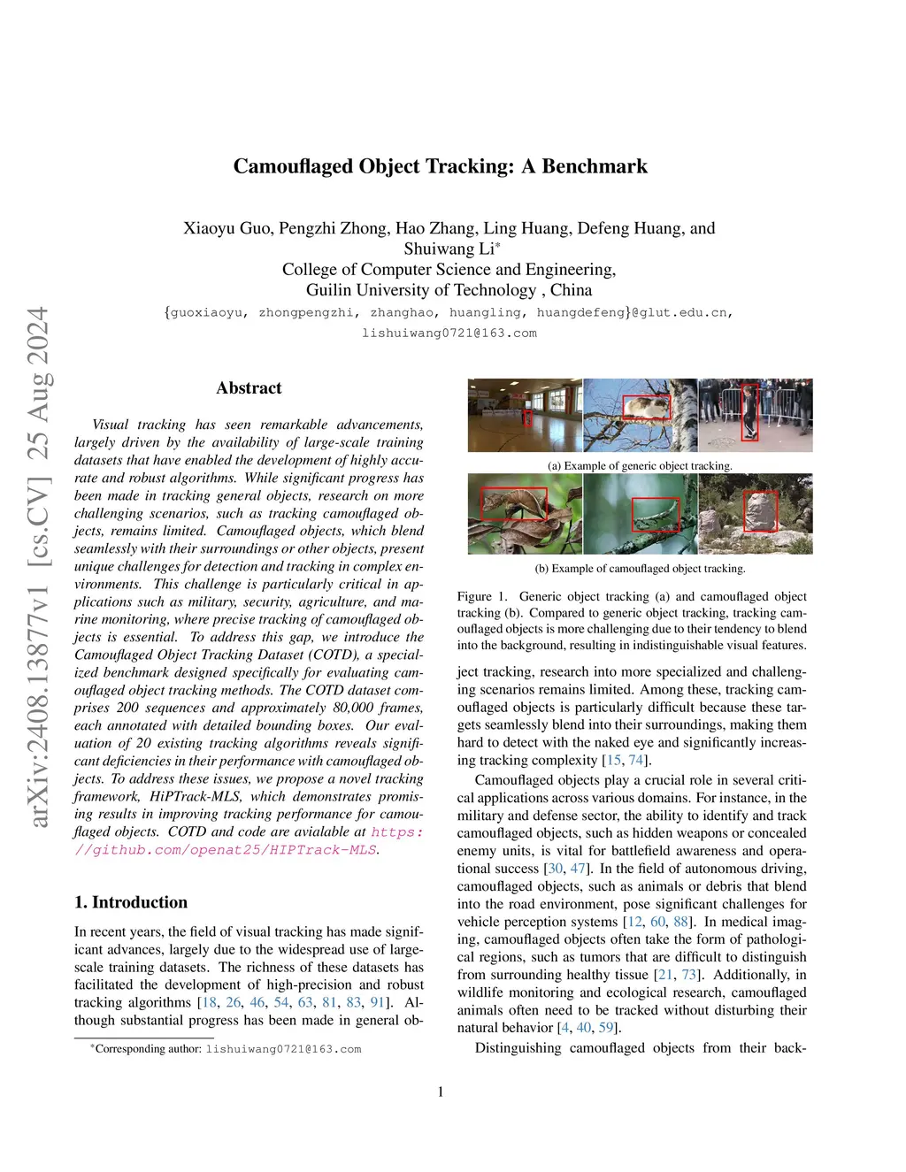 Visual tracking has seen remarkable advancements, largely driven by the availability of large-scale training datasets that have enabled the development of highly accurate and robust algorithms. While significant progress has been made in tracking general objects, research on more challenging scenarios, such as tracking camouflaged objects, remains limited. Camouflaged objects, which blend seamlessly with their surroundings or other objects, present unique challenges for detection and tracking in complex environments. This challenge is particularly critical in applications such as military, security, agriculture, and marine monitoring, where precise tracking of camouflaged objects is essential. To address this gap, we introduce the Camouflaged Object Tracking Dataset (COTD), a specialized benchmark designed specifically for evaluating camouflaged object tracking methods. The COTD dataset comprises 200 sequences and approximately 80,000 frames, each annotated with detailed bounding boxes. Our evaluation of 20 existing tracking algorithms reveals significant deficiencies in their performance with camouflaged objects. To address these issues, we propose a novel tracking framework, HiPTrack-MLS, which demonstrates promising results in improving tracking performance for camouflaged objects. COTD and code are avialable atthis https URL.