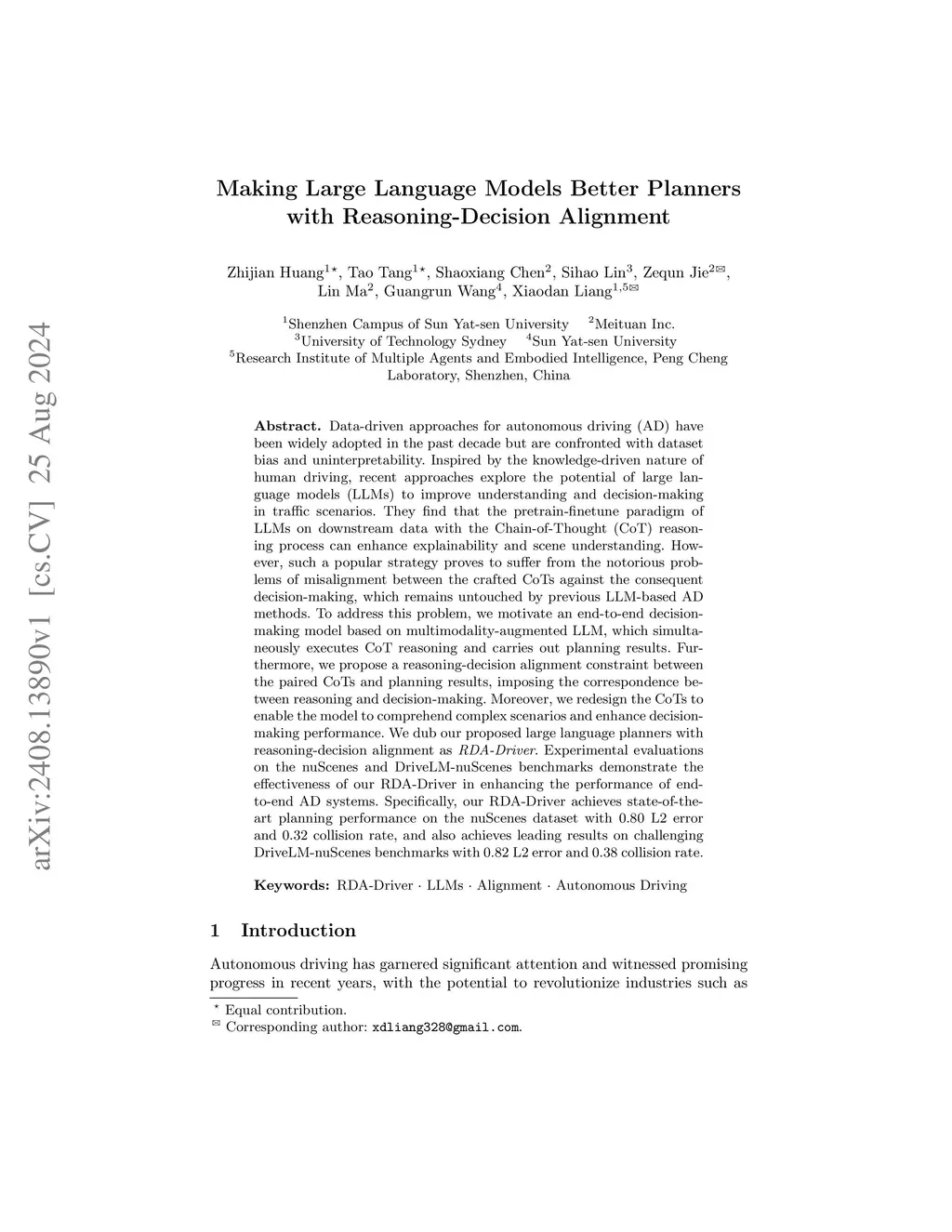 Data-driven approaches for autonomous driving (AD) have been widely adopted in the past decade but are confronted with dataset bias and uninterpretability. Inspired by the knowledge-driven nature of human driving, recent approaches explore the potential of large language models (LLMs) to improve understanding and decision-making in traffic scenarios. They find that the pretrain-finetune paradigm of LLMs on downstream data with the Chain-of-Thought (CoT) reasoning process can enhance explainability and scene understanding. However, such a popular strategy proves to suffer from the notorious problems of misalignment between the crafted CoTs against the consequent decision-making, which remains untouched by previous LLM-based AD methods. To address this problem, we motivate an end-to-end decision-making model based on multimodality-augmented LLM, which simultaneously executes CoT reasoning and carries out planning results. Furthermore, we propose a reasoning-decision alignment constraint between the paired CoTs and planning results, imposing the correspondence between reasoning and decision-making. Moreover, we redesign the CoTs to enable the model to comprehend complex scenarios and enhance decision-making performance. We dub our proposed large language planners with reasoning-decision alignment as RDA-Driver. Experimental evaluations on the nuScenes and DriveLM-nuScenes benchmarks demonstrate the effectiveness of our RDA-Driver in enhancing the performance of end-to-end AD systems. Specifically, our RDA-Driver achieves state-of-the-art planning performance on the nuScenes dataset with 0.80 L2 error and 0.32 collision rate, and also achieves leading results on challenging DriveLM-nuScenes benchmarks with 0.82 L2 error and 0.38 collision rate.