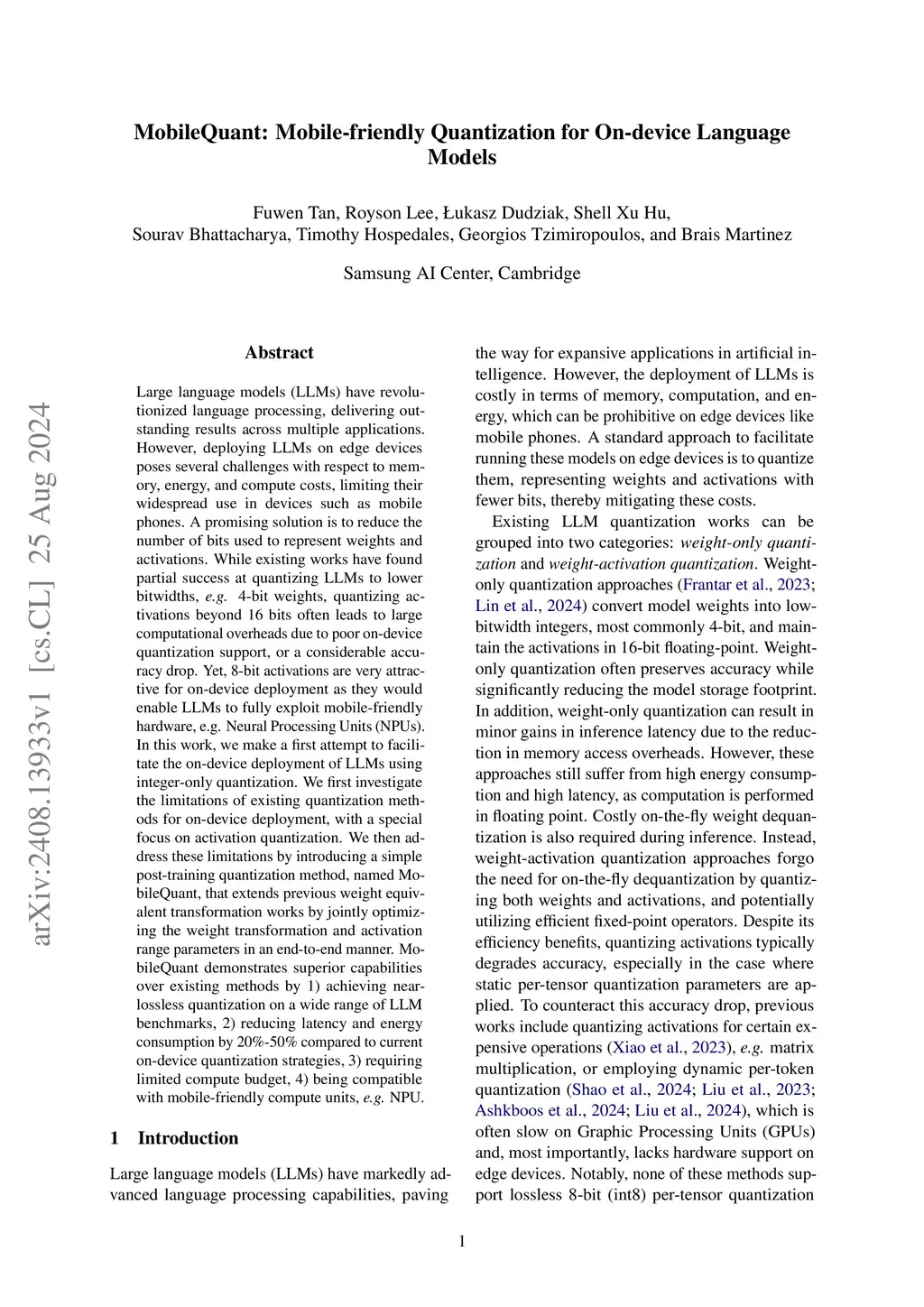 Large language models (LLMs) have revolutionized language processing, delivering outstanding results across multiple applications. However, deploying LLMs on edge devices poses several challenges with respect to memory, energy, and compute costs, limiting their widespread use in devices such as mobile phones. A promising solution is to reduce the number of bits used to represent weights and activations. While existing works have found partial success at quantizing LLMs to lower bitwidths, e.g. 4-bit weights, quantizing activations beyond 16 bits often leads to large computational overheads due to poor on-device quantization support, or a considerable accuracy drop. Yet, 8-bit activations are very attractive for on-device deployment as they would enable LLMs to fully exploit mobile-friendly hardware, e.g. Neural Processing Units (NPUs). In this work, we make a first attempt to facilitate the on-device deployment of LLMs using integer-only quantization. We first investigate the limitations of existing quantization methods for on-device deployment, with a special focus on activation quantization. We then address these limitations by introducing a simple post-training quantization method, named MobileQuant, that extends previous weight equivalent transformation works by jointly optimizing the weight transformation and activation range parameters in an end-to-end manner. MobileQuant demonstrates superior capabilities over existing methods by 1) achieving near-lossless quantization on a wide range of LLM benchmarks, 2) reducing latency and energy consumption by 20\%-50\% compared to current on-device quantization strategies, 3) requiring limited compute budget, 4) being compatible with mobile-friendly compute units, e.g. NPU.
