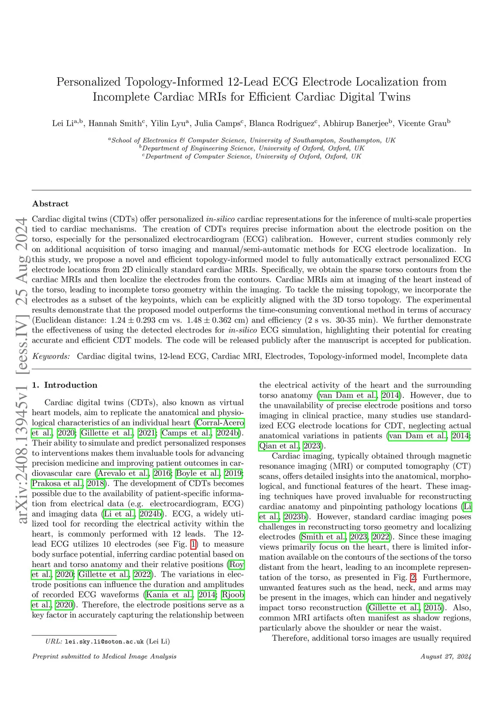 Cardiac digital twins (CDTs) offer personalized in-silico cardiac representations for the inference of multi-scale properties tied to cardiac mechanisms. The creation of CDTs requires precise information about the electrode position on the torso, especially for the personalized electrocardiogram (ECG) calibration. However, current studies commonly rely on additional acquisition of torso imaging and manual/semi-automatic methods for ECG electrode localization. In this study, we propose a novel and efficient topology-informed model to fully automatically extract personalized ECG standard electrode locations from 2D clinically standard cardiac MRIs. Specifically, we obtain the sparse torso contours from the cardiac MRIs and then localize the standard electrodes of 12-lead ECG from the contours. Cardiac MRIs aim at imaging of the heart instead of the torso, leading to incomplete torso geometry within the imaging. To tackle the missing topology, we incorporate the electrodes as a subset of the keypoints, which can be explicitly aligned with the 3D torso topology. The experimental results demonstrate that the proposed model outperforms the time-consuming conventional model projection-based method in terms of accuracy (Euclidean distance: cm vs. cm) and efficiency (~s vs. -~min). We further demonstrate the effectiveness of using the detected electrodes for in-silico ECG simulation, highlighting their potential for creating accurate and efficient CDT models. The code is available atthis https URL.