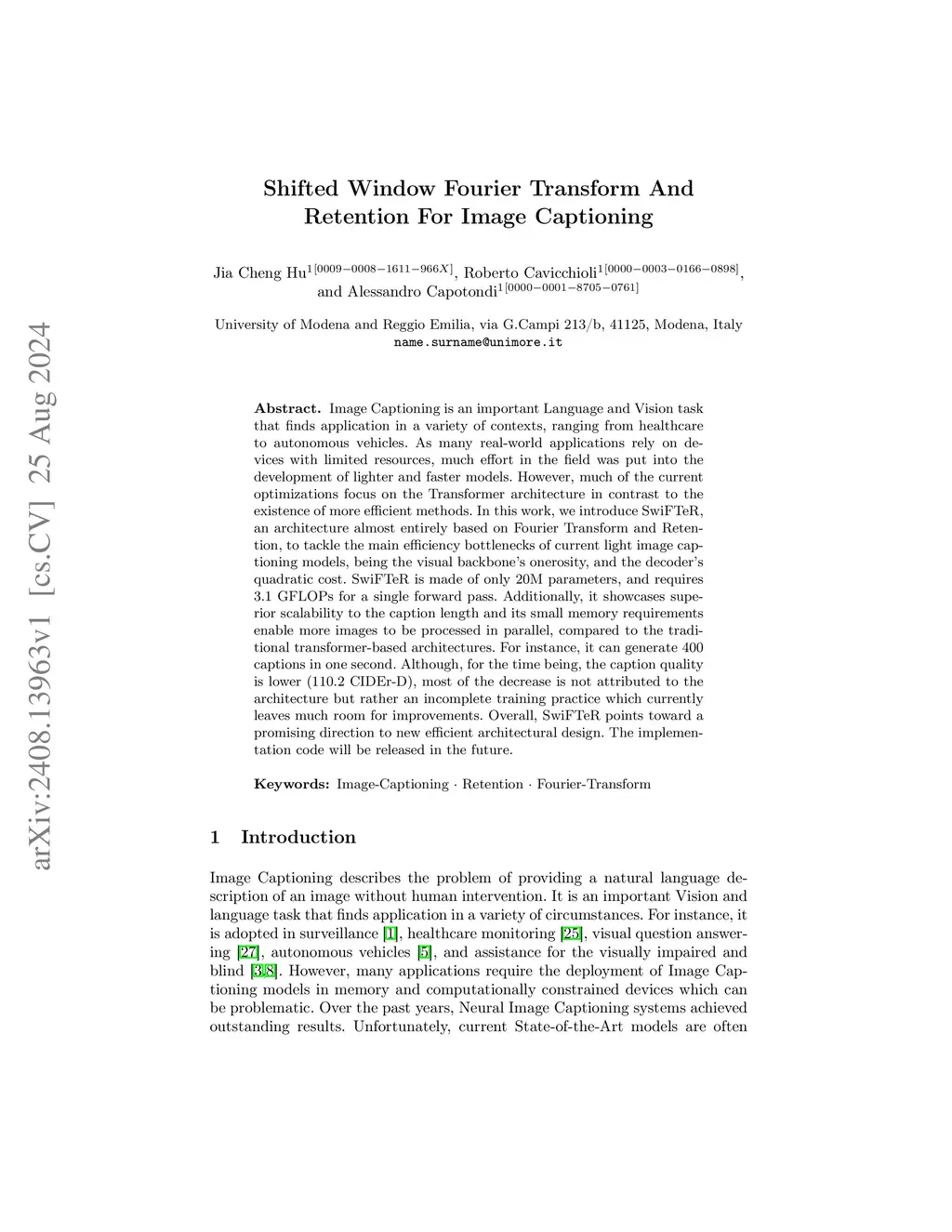 Shifted Window Fourier Transform And Retention For Image Captioning