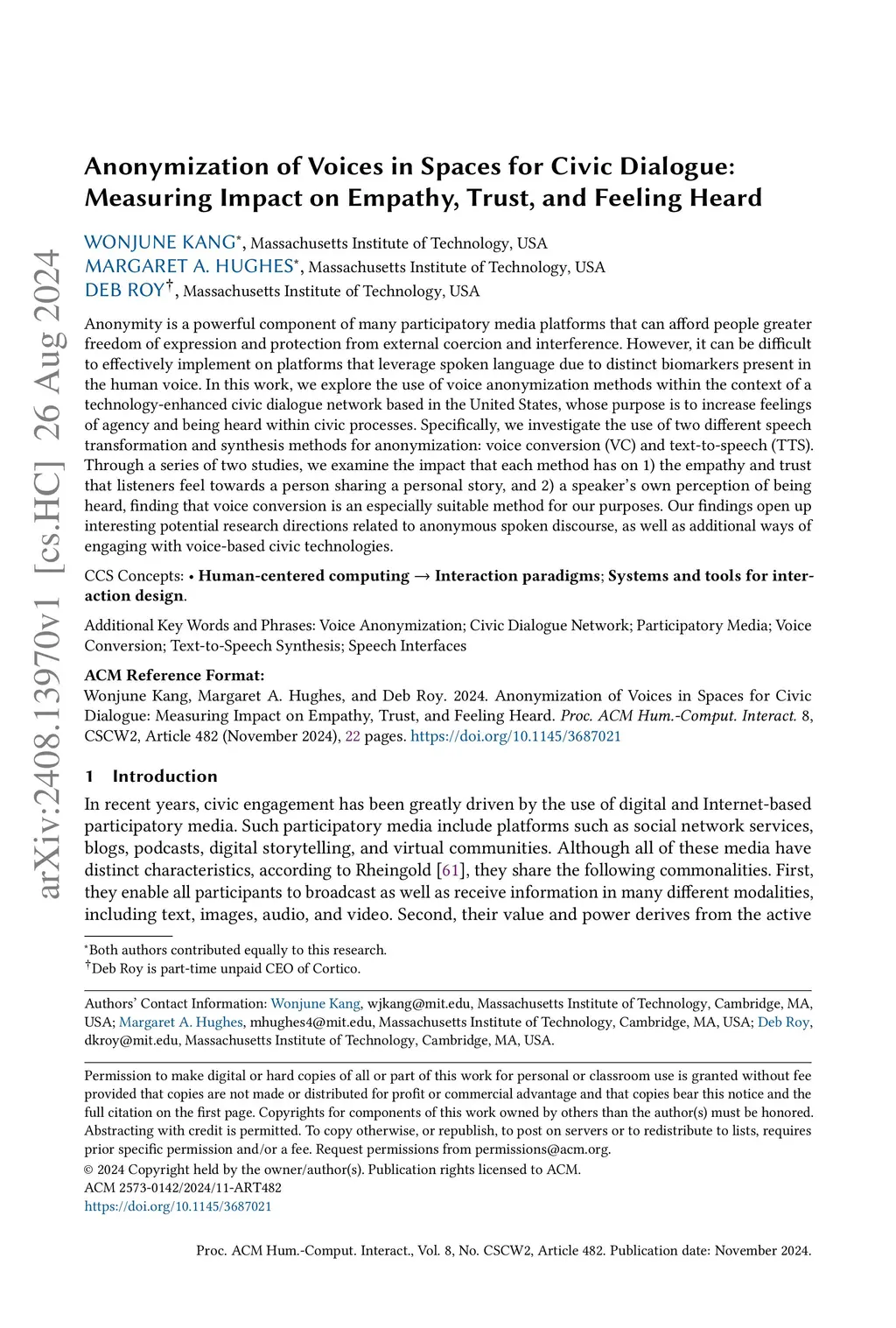 Anonymity is a powerful component of many participatory media platforms that can afford people greater freedom of expression and protection from external coercion and interference. However, it can be difficult to effectively implement on platforms that leverage spoken language due to distinct biomarkers present in the human voice. In this work, we explore the use of voice anonymization methods within the context of a technology-enhanced civic dialogue network based in the United States, whose purpose is to increase feelings of agency and being heard within civic processes. Specifically, we investigate the use of two different speech transformation and synthesis methods for anonymization: voice conversion (VC) and text-to-speech (TTS). Through a series of two studies, we examine the impact that each method has on 1) the empathy and trust that listeners feel towards a person sharing a personal story, and 2) a speaker's own perception of being heard, finding that voice conversion is an especially suitable method for our purposes. Our findings open up interesting potential research directions related to anonymous spoken discourse, as well as additional ways of engaging with voice-based civic technologies.