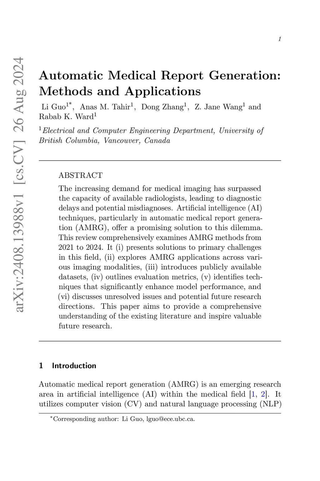 The increasing demand for medical imaging has surpassed the capacity of available radiologists, leading to diagnostic delays and potential misdiagnoses. Artificial intelligence (AI) techniques, particularly in automatic medical report generation (AMRG), offer a promising solution to this dilemma. This review comprehensively examines AMRG methods from 2021 to 2024. It (i) presents solutions to primary challenges in this field, (ii) explores AMRG applications across various imaging modalities, (iii) introduces publicly available datasets, (iv) outlines evaluation metrics, (v) identifies techniques that significantly enhance model performance, and (vi) discusses unresolved issues and potential future research directions. This paper aims to provide a comprehensive understanding of the existing literature and inspire valuable future research.