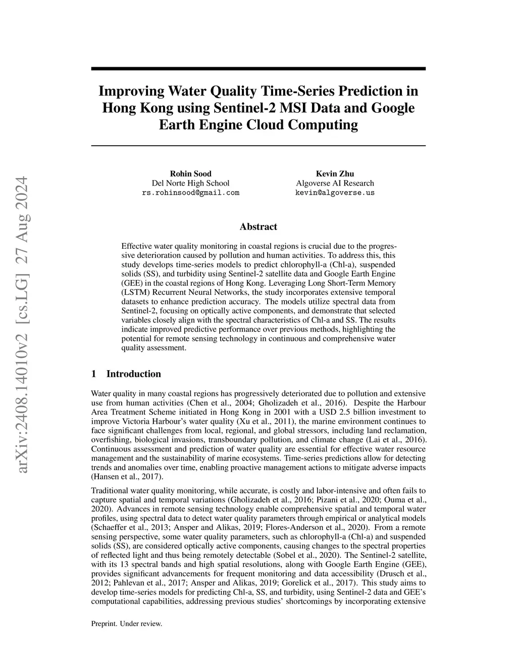 Effective water quality monitoring in coastal regions is crucial due to the progressive deterioration caused by pollution and human activities. To address this, this study develops time-series models to predict chlorophyll-a (Chl-a), suspended solids (SS), and turbidity using Sentinel-2 satellite data and Google Earth Engine (GEE) in the coastal regions of Hong Kong. Leveraging Long Short-Term Memory (LSTM) Recurrent Neural Networks, the study incorporates extensive temporal datasets to enhance prediction accuracy. The models utilize spectral data from Sentinel-2, focusing on optically active components, and demonstrate that selected variables closely align with the spectral characteristics of Chl-a and SS. The results indicate improved predictive performance over previous methods, highlighting the potential for remote sensing technology in continuous and comprehensive water quality assessment.