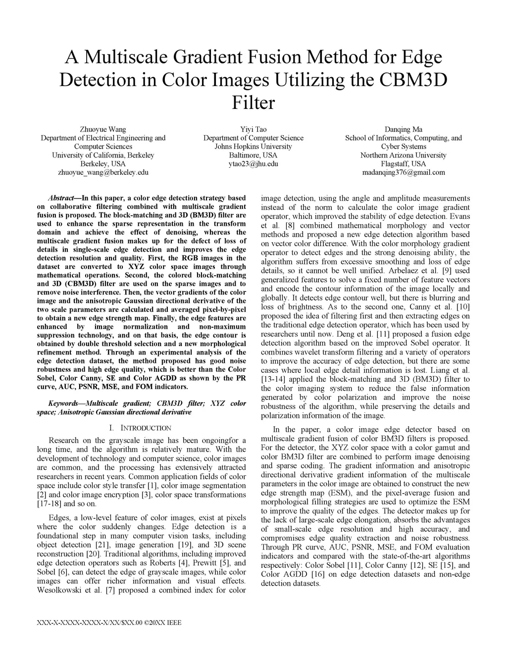 In this paper, a color edge detection strategy based on collaborative filtering combined with multiscale gradient fusion is proposed. The block-matching and 3D (BM3D) filter are used to enhance the sparse representation in the transform domain and achieve the effect of denoising, whereas the multiscale gradient fusion makes up for the defect of loss of details in single-scale edge detection and improves the edge detection resolution and quality. First, the RGB images in the dataset are converted to XYZ color space images through mathematical operations. Second, the colored block-matching and 3D (CBM3D) filter are used on the sparse images and to remove noise interference. Then, the vector gradients of the color image and the anisotropic Gaussian directional derivative of the two scale parameters are calculated and averaged pixel-by-pixel to obtain a new edge strength map. Finally, the edge features are enhanced by image normalization and non-maximum suppression technology, and on that basis, the edge contour is obtained by double threshold selection and a new morphological refinement method. Through an experimental analysis of the edge detection dataset, the method proposed has good noise robustness and high edge quality, which is better than the Color Sobel, Color Canny, SE and Color AGDD as shown by the PR curve, AUC, PSNR, MSE, and FOM indicators.