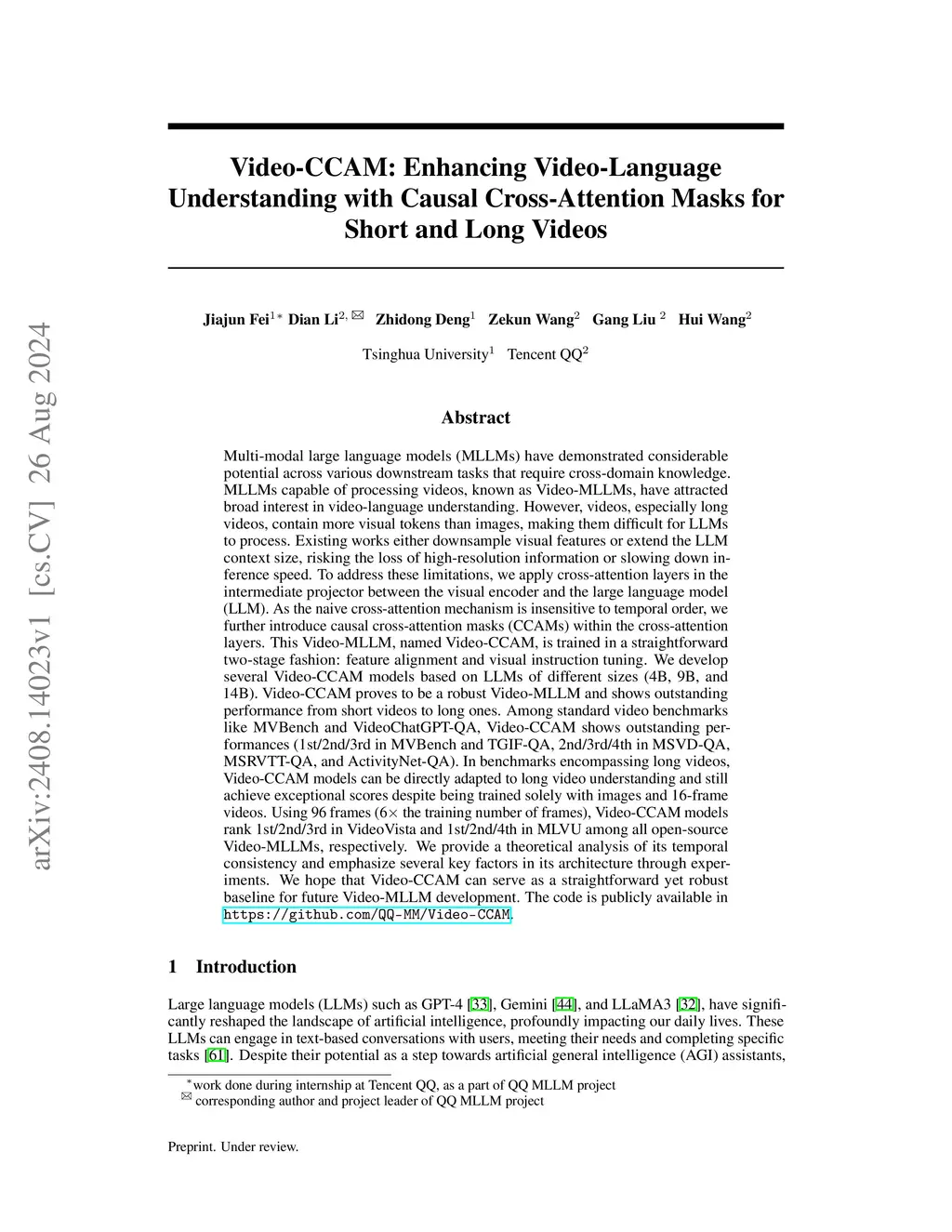 Multi-modal large language models (MLLMs) have demonstrated considerable potential across various downstream tasks that require cross-domain knowledge. MLLMs capable of processing videos, known as Video-MLLMs, have attracted broad interest in video-language understanding. However, videos, especially long videos, contain more visual tokens than images, making them difficult for LLMs to process. Existing works either downsample visual features or extend the LLM context size, risking the loss of high-resolution information or slowing down inference speed. To address these limitations, we apply cross-attention layers in the intermediate projector between the visual encoder and the large language model (LLM). As the naive cross-attention mechanism is insensitive to temporal order, we further introduce causal cross-attention masks (CCAMs) within the cross-attention layers. This Video-MLLM, named Video-CCAM, is trained in a straightforward two-stage fashion: feature alignment and visual instruction tuning. We develop several Video-CCAM models based on LLMs of different sizes (4B, 9B, and 14B). Video-CCAM proves to be a robust Video-MLLM and shows outstanding performance from short videos to long ones. Among standard video benchmarks like MVBench and VideoChatGPT-QA, Video-CCAM shows outstanding performances (1st/2nd/3rd in MVBench and TGIF-QA, 2nd/3rd/4th in MSVD-QA, MSRVTT-QA, and ActivityNet-QA). In benchmarks encompassing long videos, Video-CCAM models can be directly adapted to long video understanding and still achieve exceptional scores despite being trained solely with images and 16-frame videos. Using 96 frames (6 the training number of frames), Video-CCAM models rank 1st/2nd/3rd in VideoVista and 1st/2nd/4th in MLVU among all open-source Video-MLLMs, respectively. The code is publicly available in \url{https://github.com/QQ-MM/Video-CCAM}.