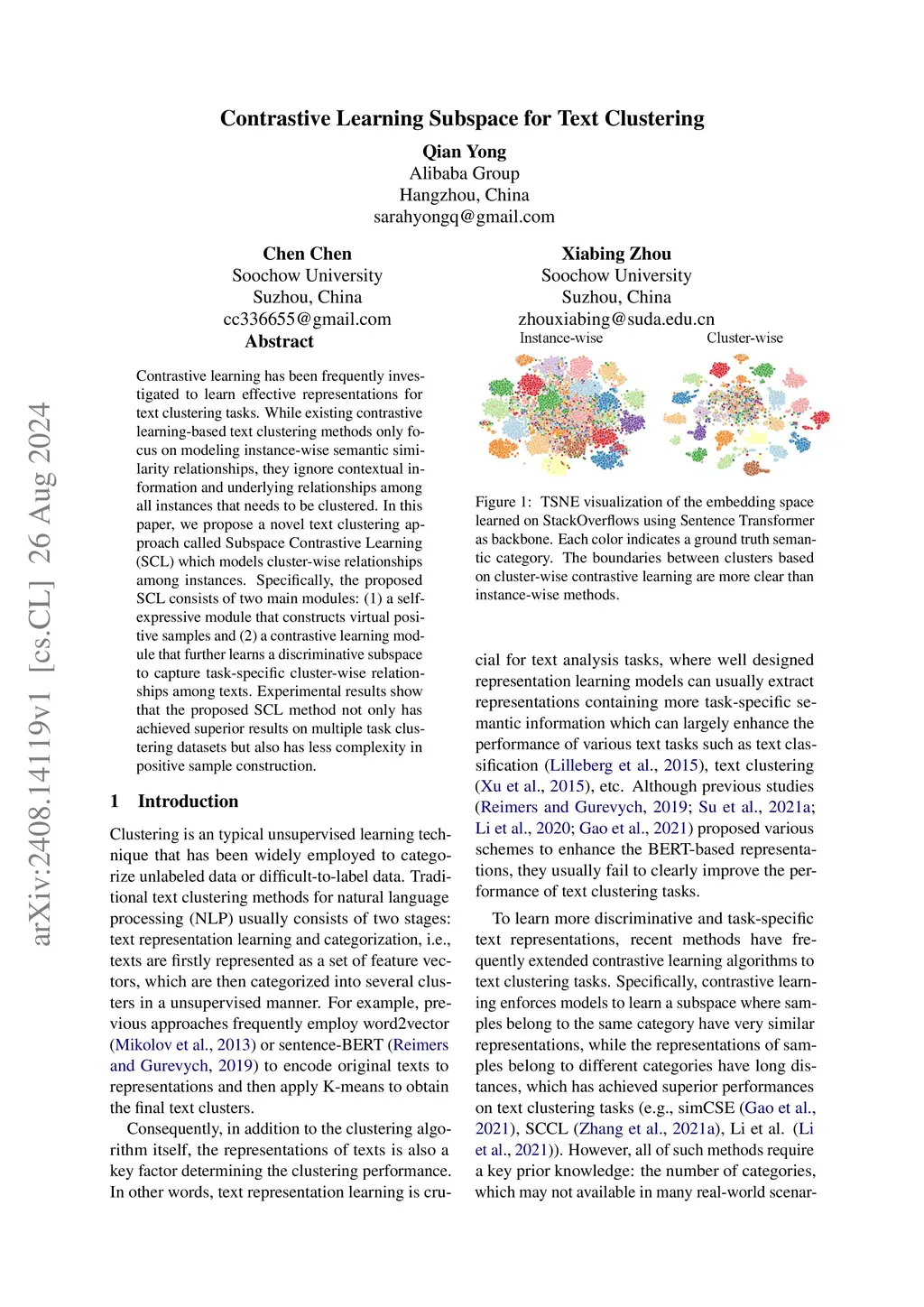 Contrastive learning has been frequently investigated to learn effective representations for text clustering tasks. While existing contrastive learning-based text clustering methods only focus on modeling instance-wise semantic similarity relationships, they ignore contextual information and underlying relationships among all instances that needs to be clustered. In this paper, we propose a novel text clustering approach called Subspace Contrastive Learning (SCL) which models cluster-wise relationships among instances. Specifically, the proposed SCL consists of two main modules: (1) a self-expressive module that constructs virtual positive samples and (2) a contrastive learning module that further learns a discriminative subspace to capture task-specific cluster-wise relationships among texts. Experimental results show that the proposed SCL method not only has achieved superior results on multiple task clustering datasets but also has less complexity in positive sample construction.