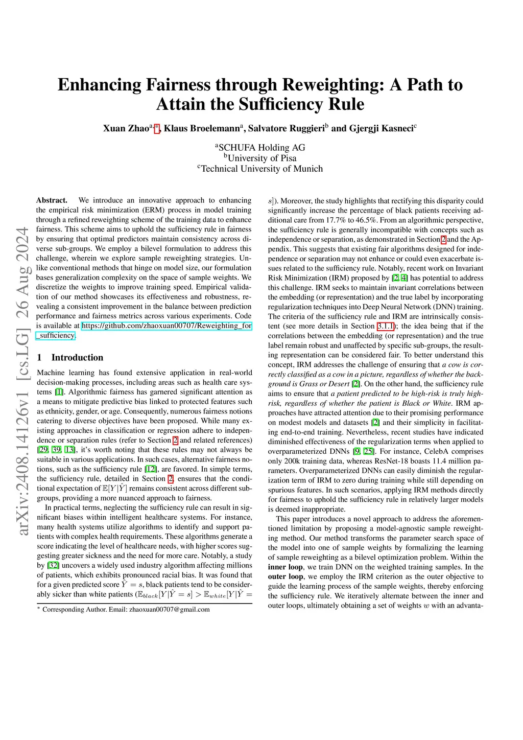 We introduce an innovative approach to enhancing the empirical risk minimization (ERM) process in model training through a refined reweighting scheme of the training data to enhance fairness. This scheme aims to uphold the sufficiency rule in fairness by ensuring that optimal predictors maintain consistency across diverse sub-groups. We employ a bilevel formulation to address this challenge, wherein we explore sample reweighting strategies. Unlike conventional methods that hinge on model size, our formulation bases generalization complexity on the space of sample weights. We discretize the weights to improve training speed. Empirical validation of our method showcases its effectiveness and robustness, revealing a consistent improvement in the balance between prediction performance and fairness metrics across various experiments.