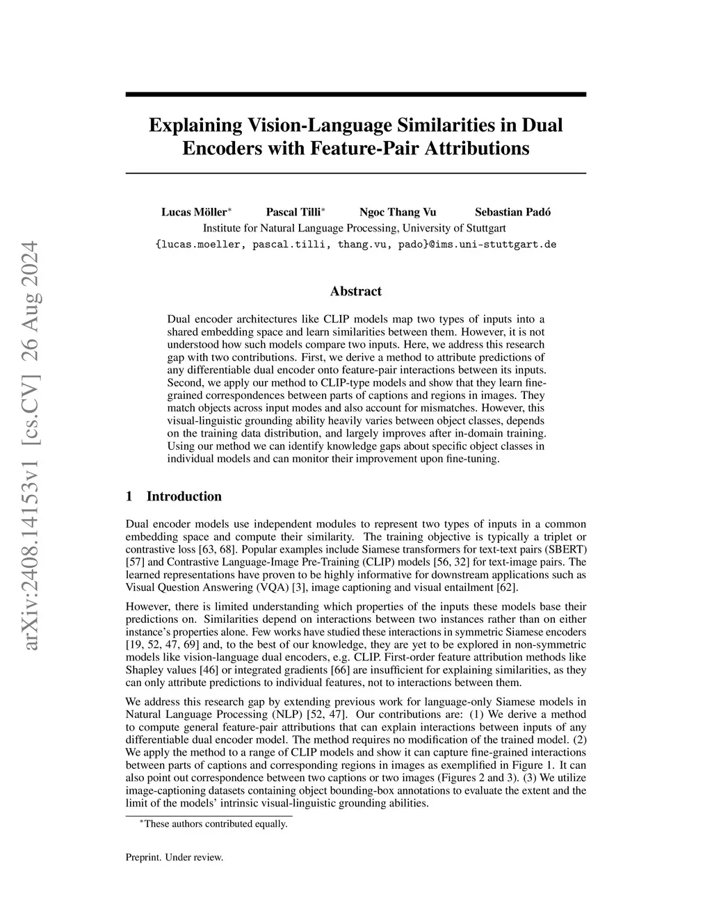 Dual encoder architectures like Clip models map two types of inputs into a shared embedding space and predict similarities between them. Despite their wide application, it is, however, not understood how these models compare their two inputs. Common first-order feature-attribution methods explain importances of individual features and can, thus, only provide limited insights into dual encoders, whose predictions depend on interactions between features. In this paper, we first derive a second-order method enabling the attribution of predictions by any differentiable dual encoder onto feature-interactions between its inputs. Second, we apply our method to Clip models and show that they learn fine-grained correspondences between parts of captions and regions in images. They match objects across input modes and also account for mismatches. This intrinsic visual-linguistic grounding ability, however, varies heavily between object classes, exhibits pronounced out-of-domain effects and we can identify individual errors as well as systematic failure categories. Code is publicly available:this https URL