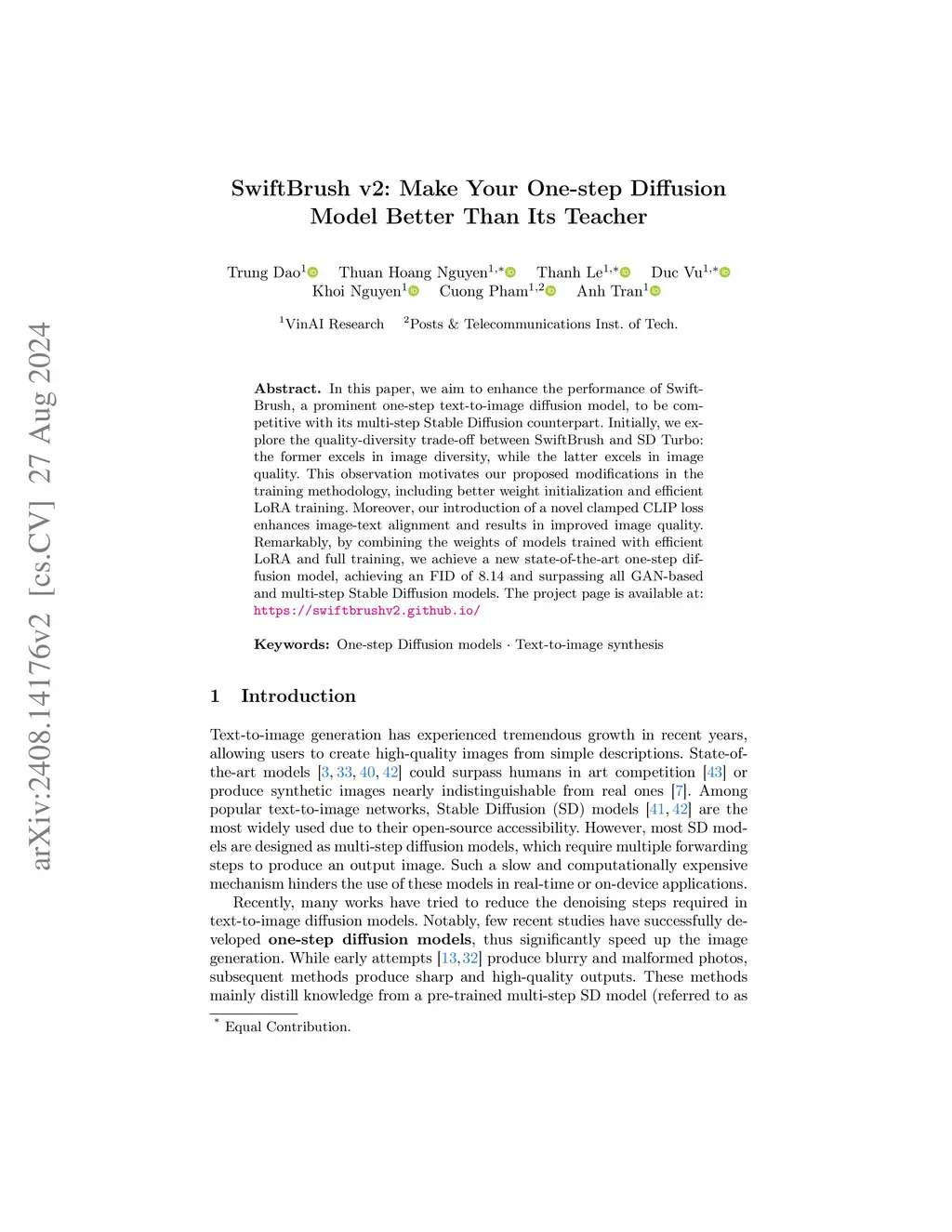In this paper, we aim to enhance the performance of SwiftBrush, a prominent one-step text-to-image diffusion model, to be competitive with its multi-step Stable Diffusion counterpart. Initially, we explore the quality-diversity trade-off between SwiftBrush and SD Turbo: the former excels in image diversity, while the latter excels in image quality. This observation motivates our proposed modifications in the training methodology, including better weight initialization and efficient LoRA training. Moreover, our introduction of a novel clamped CLIP loss enhances image-text alignment and results in improved image quality. Remarkably, by combining the weights of models trained with efficient LoRA and full training, we achieve a new state-of-the-art one-step diffusion model, achieving an FID of 8.14 and surpassing all GAN-based and multi-step Stable Diffusion models. The project page is available at https://swiftbrushv2.github.io.