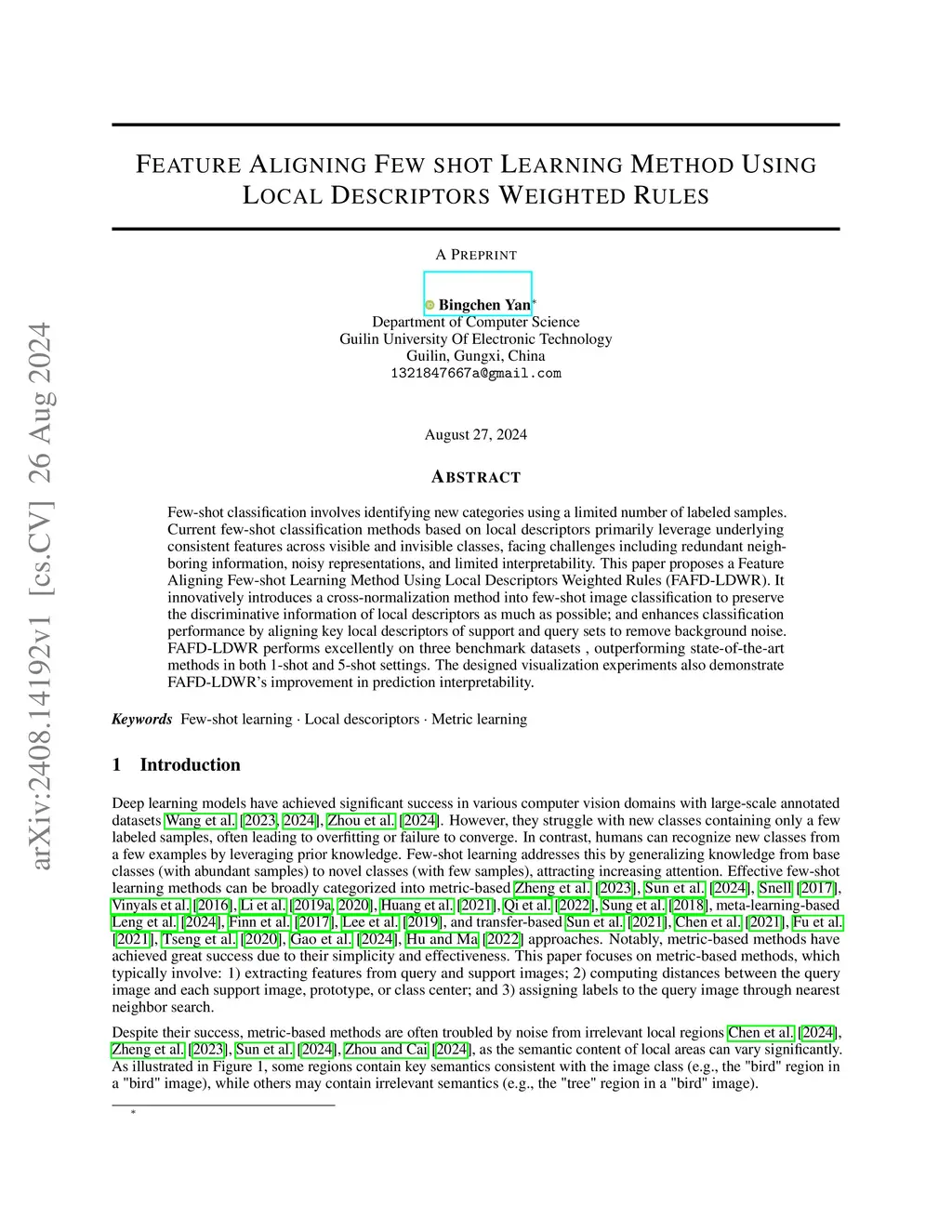 Few-shot classification involves identifying new categories using a limited number of labeled samples. Current few-shot classification methods based on local descriptors primarily leverage underlying consistent features across visible and invisible classes, facing challenges including redundant neighboring information, noisy representations, and limited interpretability. This paper proposes a Feature Aligning Few-shot Learning Method Using Local Descriptors Weighted Rules (FAFD-LDWR). It innovatively introduces a cross-normalization method into few-shot image classification to preserve the discriminative information of local descriptors as much as possible; and enhances classification performance by aligning key local descriptors of support and query sets to remove background noise. FAFD-LDWR performs excellently on three benchmark datasets , outperforming state-of-the-art methods in both 1-shot and 5-shot settings. The designed visualization experiments also demonstrate FAFD-LDWR's improvement in prediction interpretability.