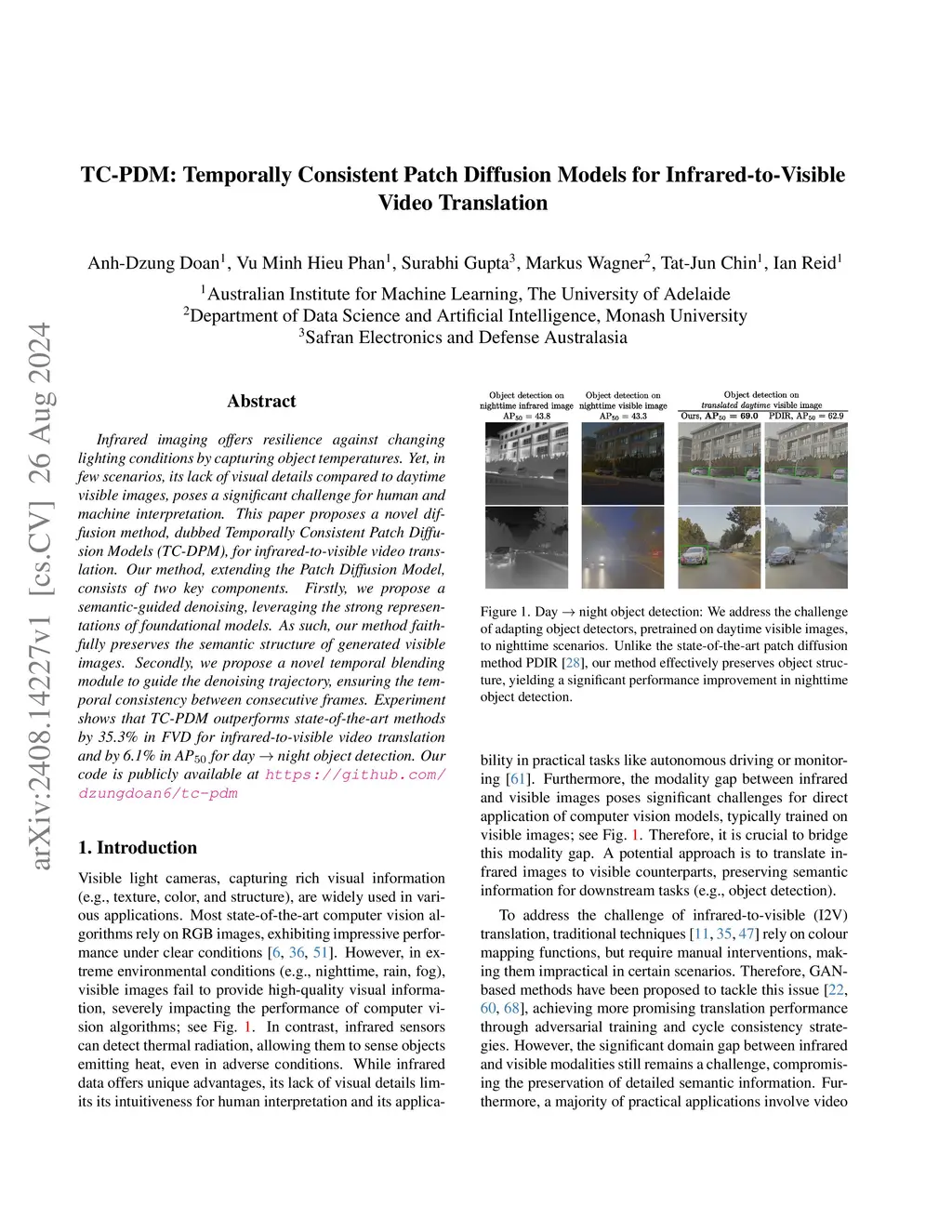 Infrared imaging offers resilience against changing lighting conditions by capturing object temperatures. Yet, in few scenarios, its lack of visual details compared to daytime visible images, poses a significant challenge for human and machine interpretation. This paper proposes a novel diffusion method, dubbed Temporally Consistent Patch Diffusion Models (TC-DPM), for infrared-to-visible video translation. Our method, extending the Patch Diffusion Model, consists of two key components. Firstly, we propose a semantic-guided denoising, leveraging the strong representations of foundational models. As such, our method faithfully preserves the semantic structure of generated visible images. Secondly, we propose a novel temporal blending module to guide the denoising trajectory, ensuring the temporal consistency between consecutive frames. Experiment shows that TC-PDM outperforms state-of-the-art methods by 35.3% in FVD for infrared-to-visible video translation and by 6.1% in AP50 for day-to-night object detection. Our code is publicly available at https://github.com/dzungdoan6/tc-pdm