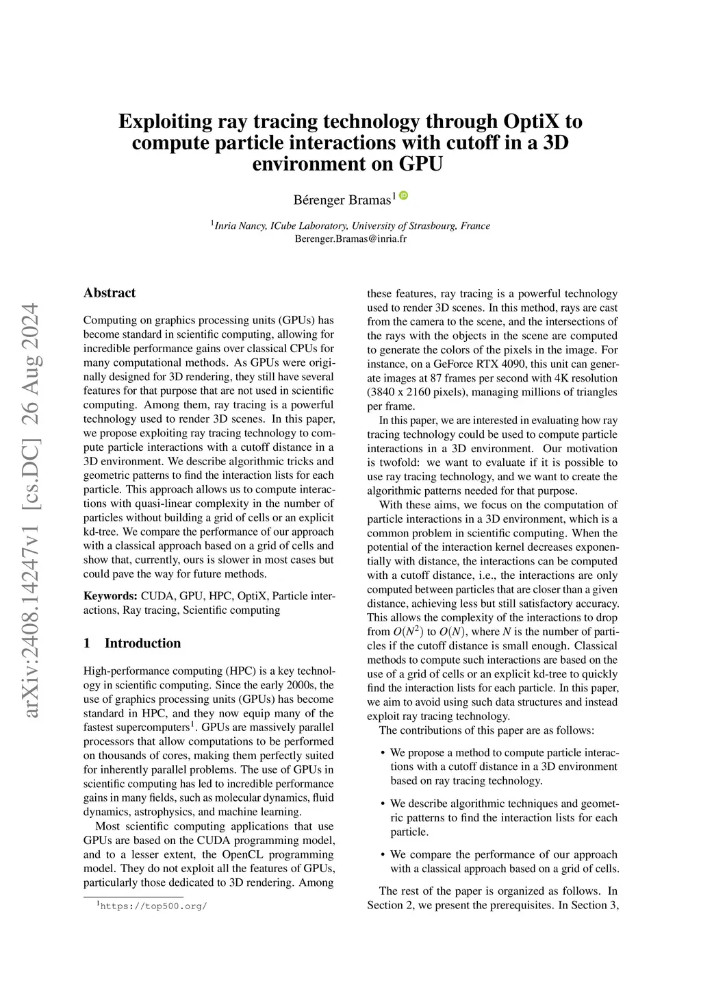 Computing on graphics processing units (GPUs) has become standard in scientific computing, allowing for incredible performance gains over classical CPUs for many computational methods. As GPUs were originally designed for 3D rendering, they still have several features for that purpose that are not used in scientific computing. Among them, ray tracing is a powerful technology used to render 3D scenes. In this paper, we propose exploiting ray tracing technology to compute particle interactions with a cutoff distance in a 3D environment. We describe algorithmic tricks and geometric patterns to find the interaction lists for each particle. This approach allows us to compute interactions with quasi-linear complexity in the number of particles without building a grid of cells or an explicit kd-tree. We compare the performance of our approach with a classical approach based on a grid of cells and show that, currently, ours is slower in most cases but could pave the way for future methods.
