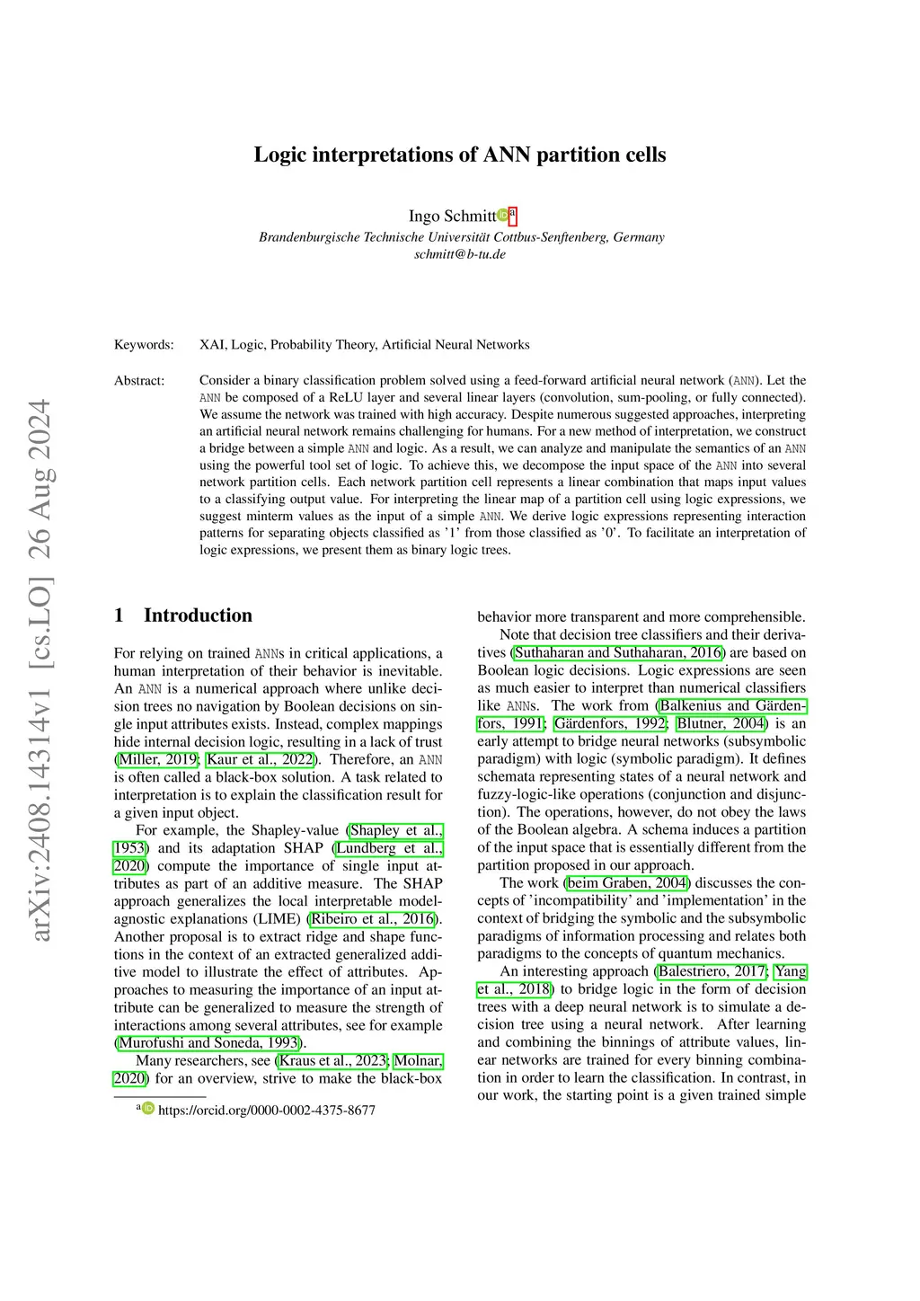 Consider a binary classification problem solved using a feed-forward artificial neural network (ANN). Let the ANN be composed of a ReLU layer and several linear layers (convolution, sum-pooling, or fully connected). We assume the network was trained with high accuracy. Despite numerous suggested approaches, interpreting an artificial neural network remains challenging for humans. For a new method of interpretation, we construct a bridge between a simple ANN and logic. As a result, we can analyze and manipulate the semantics of an ANN using the powerful tool set of logic. To achieve this, we decompose the input space of the ANN into several network partition cells. Each network partition cell represents a linear combination that maps input values to a classifying output value. For interpreting the linear map of a partition cell using logic expressions, we suggest minterm values as the input of a simple ANN. We derive logic expressions representing interaction patterns for separating objects classified as 1 from those classified as 0. To facilitate an interpretation of logic expressions, we present them as binary logic trees.