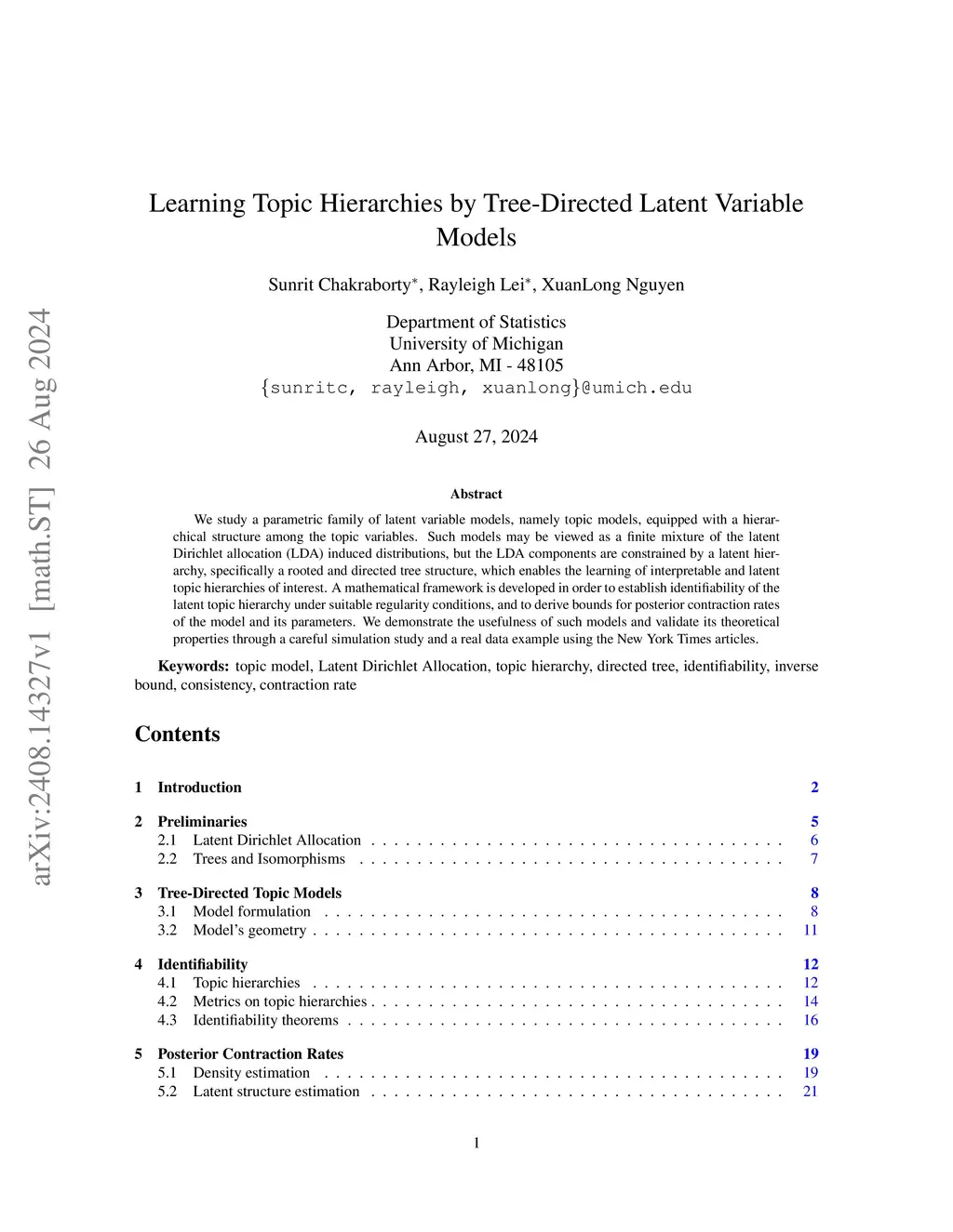 We study a parametric family of latent variable models, namely topic models, equipped with a hierarchical structure among the topic variables. Such models may be viewed as a finite mixture of the latent Dirichlet allocation (LDA) induced distributions, but the LDA components are constrained by a latent hierarchy, specifically a rooted and directed tree structure, which enables the learning of interpretable and latent topic hierarchies of interest. A mathematical framework is developed in order to establish identifiability of the latent topic hierarchy under suitable regularity conditions, and to derive bounds for posterior contraction rates of the model and its parameters. We demonstrate the usefulness of such models and validate its theoretical properties through a careful simulation study and a real data example using the New York Times articles.